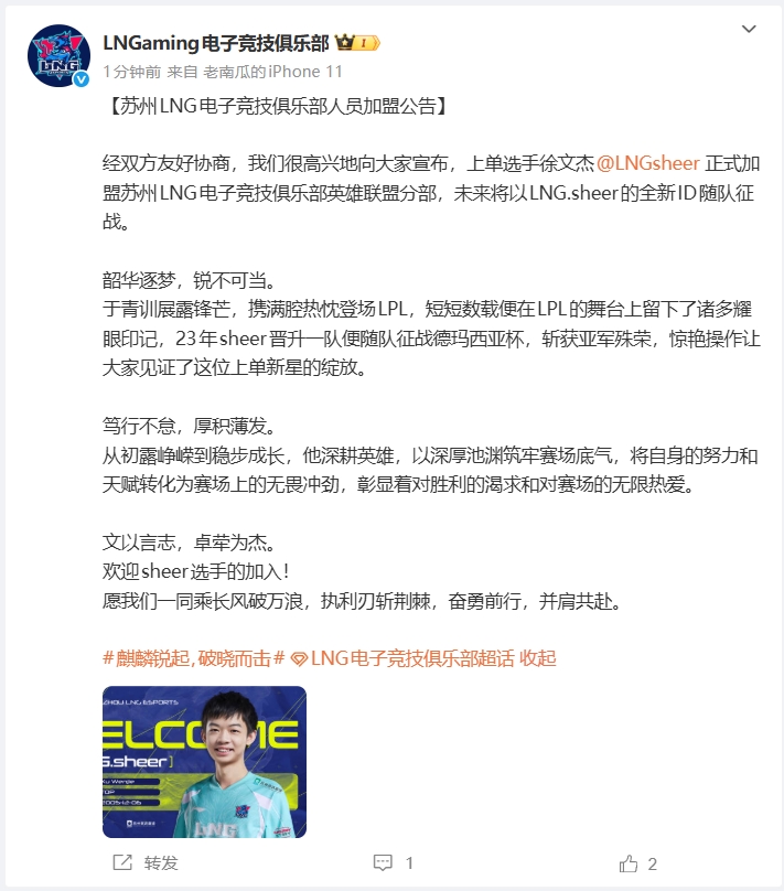 直播吧12月06日讯官方消息,苏州LNG俱乐部宣布人员变动消息,前JDG上单选手、自由人Sheer加盟队伍,随队备战2026赛季。