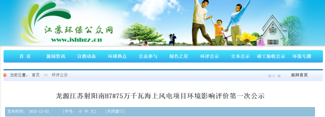 12月3日,江苏环保公众网发布《龙源江苏射阳南H7#75万千瓦海上风电项目环境影响评价第一次公示》。