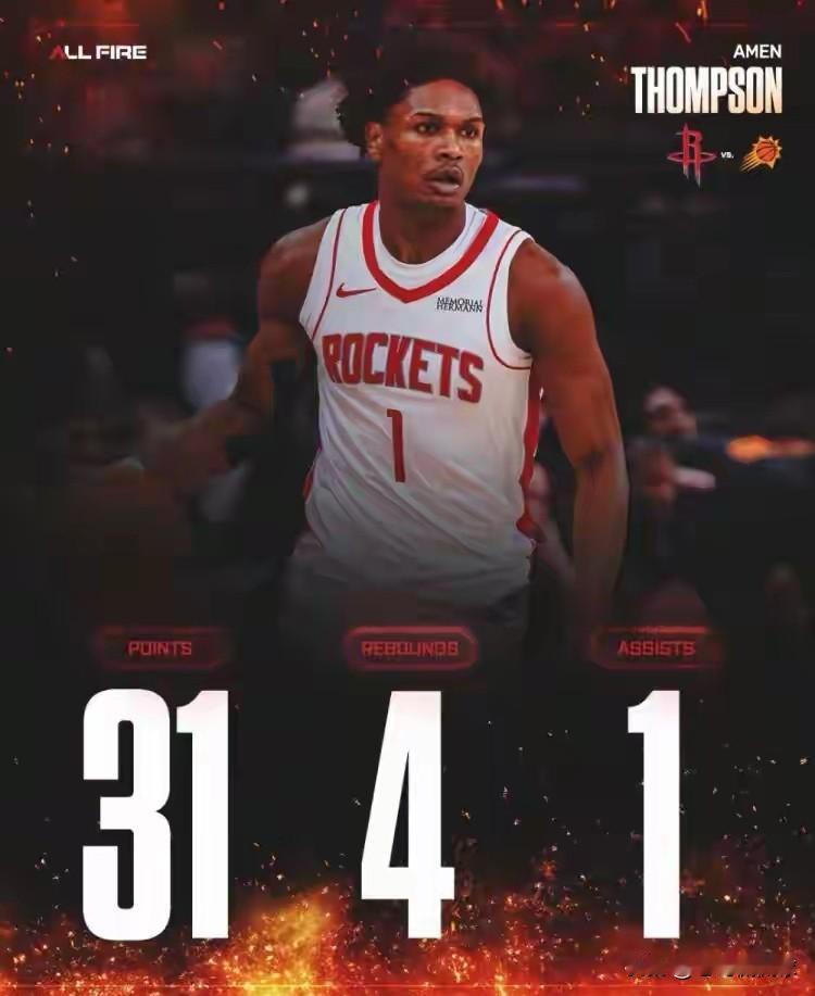 火箭超级新星阿门-汤普森真是球队的香饽饽!在今天火箭主场以117:98大胜太阳的赛后,火箭官方特意更新社媒晒出了阿门-汤普森本场比赛的数据海报,以此来称赞阿门的出色表现。 值得一提的是,本场比赛阿门在攻防两端都打出了堪称完美的表现,他是球队获胜的最大功臣。毫不夸张的说,阿门距离成为一名超级巨星已经越来越近了。