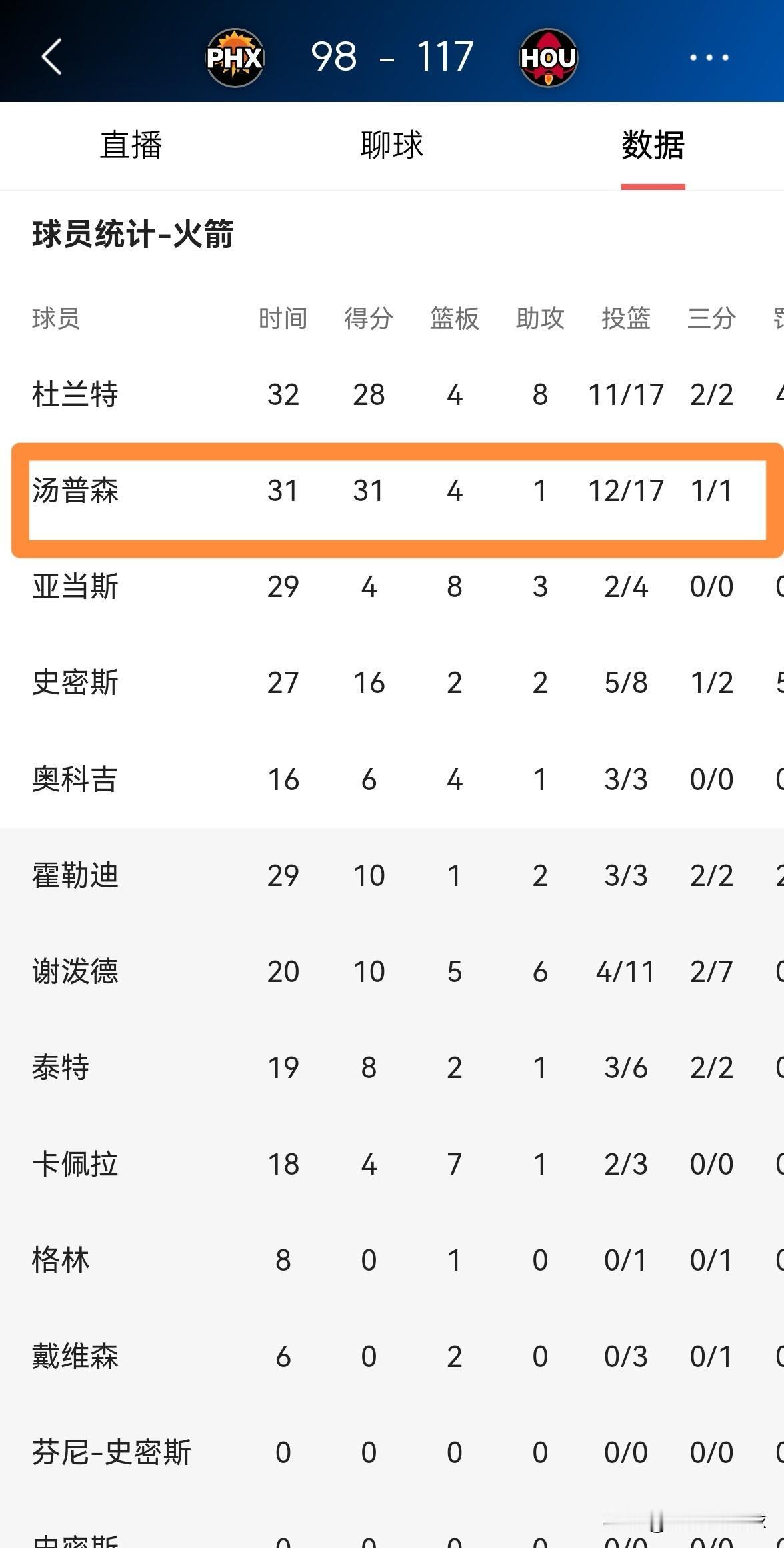 火箭超级新星阿门-汤普森真是球队的香饽饽!在今天火箭主场以117:98大胜太阳的