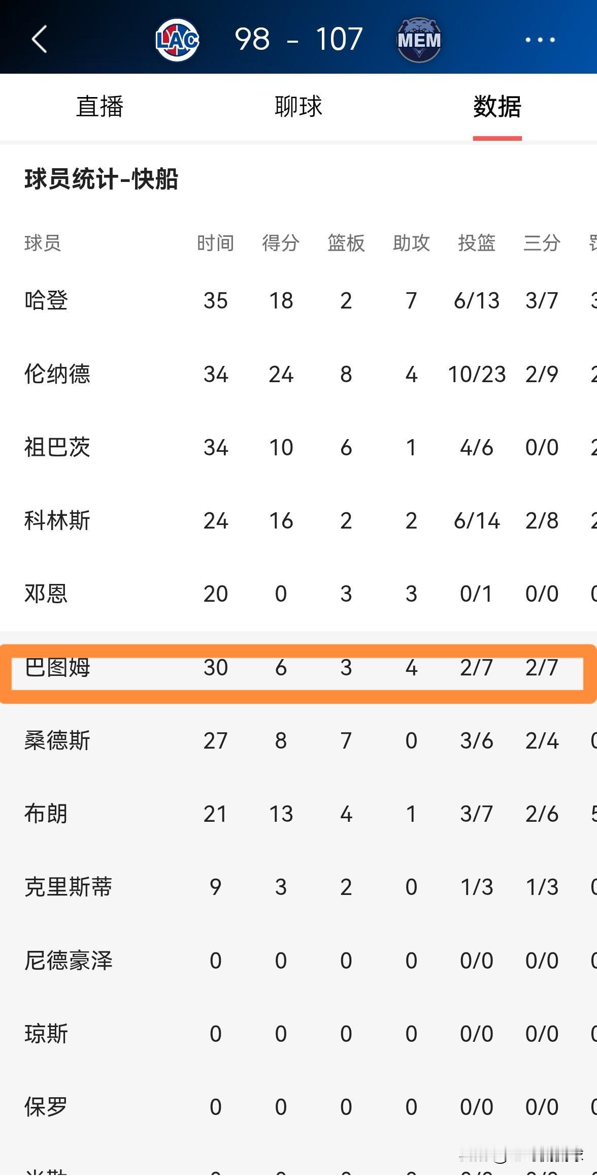 快船老将巴图姆真是虽败犹荣!在今天快船客场以98:107输给灰熊的比赛中,巴图姆在攻防两端都燃尽了。全场比赛下来,巴图姆替补出战30分钟,三分球7中2得到6分3篮板4助攻2抢断,他的场上正负值为全队最高的+9。 实事求是的说,本场比赛巴图姆绝对是虽败犹荣,他在攻防两端都倾其所有,没有辜负哪怕一秒钟的上场时间。