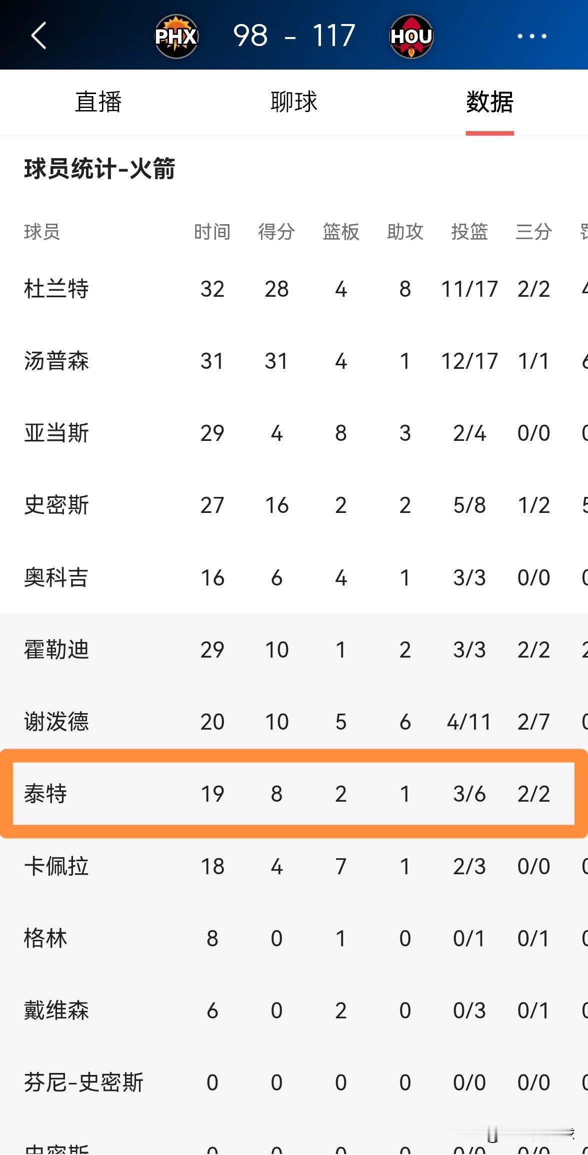 火箭悍将泰特真是颇受主帅乌度卡的重用!在今天火箭主场以117:98大胜太阳的比赛