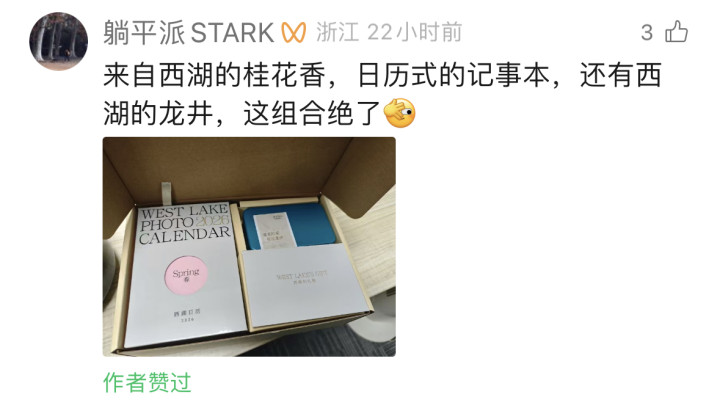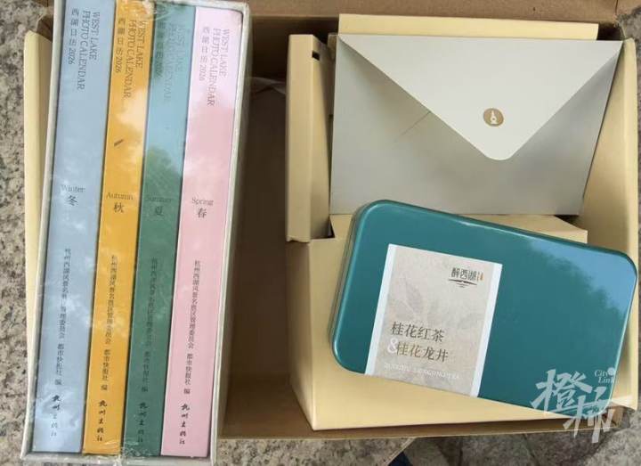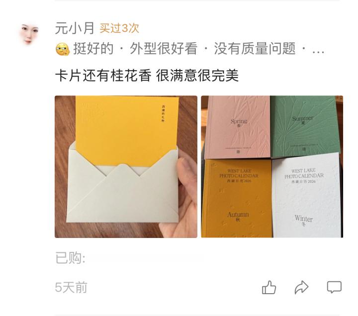 橙友我家囡囡购买的是精装礼盒款,搭配有定制卡片及醉西湖定制茶叶套装(桂花红茶5g+桂花龙井5g),附赠的金黄色卡片,能闻到桂花香味。她说,把这本日历放在书桌最显眼的地方,春天翻到柳叶暗纹的春册,就去苏堤看新柳抽芽;夏天对着荷叶纹路的夏册,去曲院风荷听蝉鸣……就是一整年和西湖的专属回忆,一定好好珍藏,让每个平凡的日子,都有西湖的山山水水陪着。