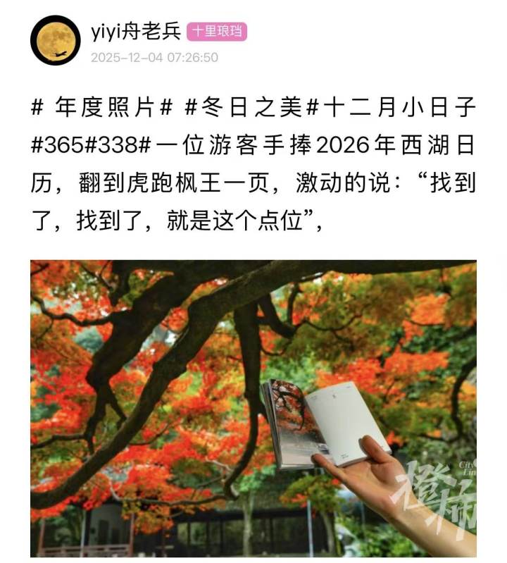 橙友yiyi舟老兵在虎跑公园看到一位游客手捧《西湖日历2026》,翻到“虎跑枫王”的一页,拍下同款打卡点位图。