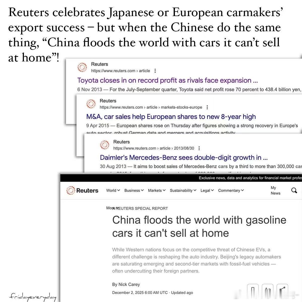 西方媒体点评中日汽车的双标现场,真是让人笑出声。 丰田在东京车展摆出概念车叫“技术传承”,中国车企展示同级别产品就成了“抄袭炫技”; 日系在北美销量下滑是“供应链波动”,中国出口增长就是“倾销冲击”; 甚至日本制造曝出数据篡改、潜艇偷工减料,报道标题也只是轻飘飘的“质量风波”,而中国车企在欧洲建厂,立马被扣上“颠覆市场规则”的帽子。说白了,西方世界只认为东方只配守着袜子生产线,造汽车本就是“越界”,卖到海外更是“罪加一等”。