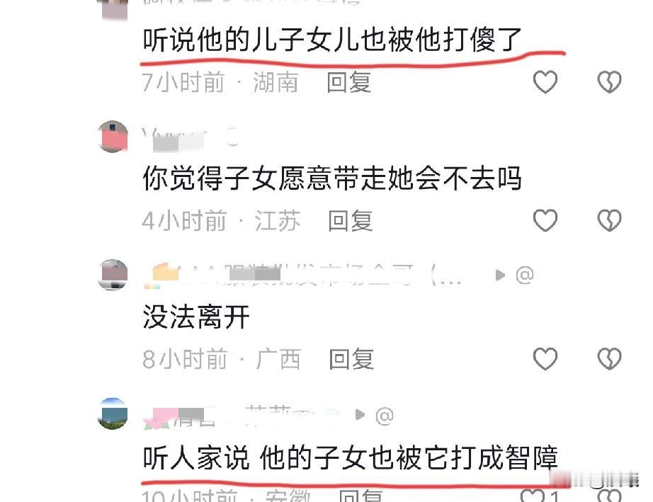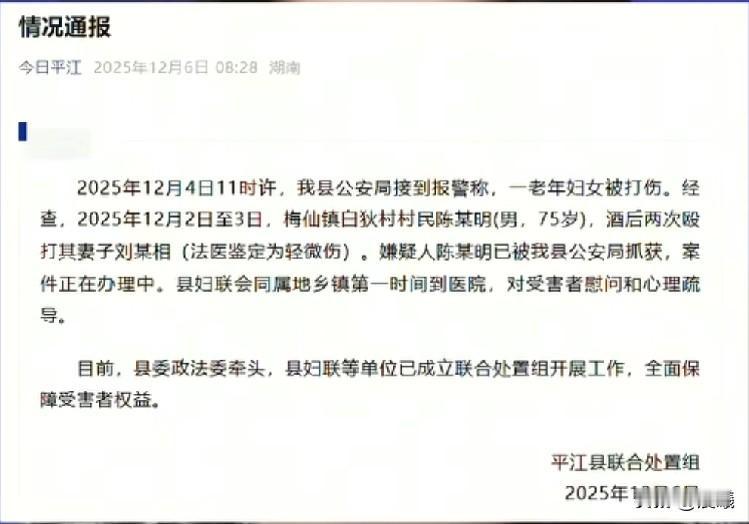 湖南平江女子的伤来自家暴,警方通报75岁丈夫被抓获,知情者称女子才45岁,有儿女,不过情况堪忧。 湖南平江街头,一个满脸是伤的女人木讷地站着,她叫刘某相,她穿着与自己身材不符的男装,脸上伤痕累累,青紫加上红肿,尤其眼部,已经无法睁开,耳朵也被撕裂,血红的伤口正被初冬冷风侵着。 她就静静地站着,与周围和谐的氛围不相符,她的情况引起众人注意,有熟悉的人称是被家暴了,而且这不是第一次。 看着女人可怜,好心人报了警,警方介入,当地妇联以及有关部门介入,带着女人去医院检查并治疗,并且进行心理疏导,还做了伤情鉴定,被认定是轻微伤。 警方查明基本情况,将女人的老公抓获。原来她老公75岁,但不管多大年龄,只要犯了法,就要受到法律制裁。 有网友猜测,刘某相差不多60岁左右,这也是看到她的样子猜测的,毕竟脸部肿胀加上穿衣不合体,让人无法判断,事情发生后,由于人们关心,她的这段视频在网络平台出现,有知情者看了就曝出事情。 原来这个刘某相并不是60岁左右,而是45岁,并且她也有子女,但让人揪心的是,她的孩子也经常遭受那个75岁老男人的家暴,所以也是不敢言语,大致上跟他母亲状态差不多,并且智力也有问题了。 看了知情者爆料,让人很是心疼,并且有点不理解。女人45岁,她的老公75岁,夫妻两人相差10岁左右的情况,生活中很多。 而在现实生活中相差30岁这情况,除非男人是成功人士,女人因为崇拜与爱慕,才会选择与他相伴余生,但从刘某相穿戴打扮来看,大脑再丰富思维再开阔的人也想想不到他的那个75岁的老公会是成功人士,这事让人有无限的质疑。 不过既然警方已经介入,相信会调查了解清楚的,不过家暴这事。看着真让人上火,你说已经连孩子都有了,并且已经到了这把年纪,好好过日子不行吗,为什么非要折腾呢,如果不爱,学会放手,给别人一个自由生存的机会,也是对自己的救赎,你说呢?