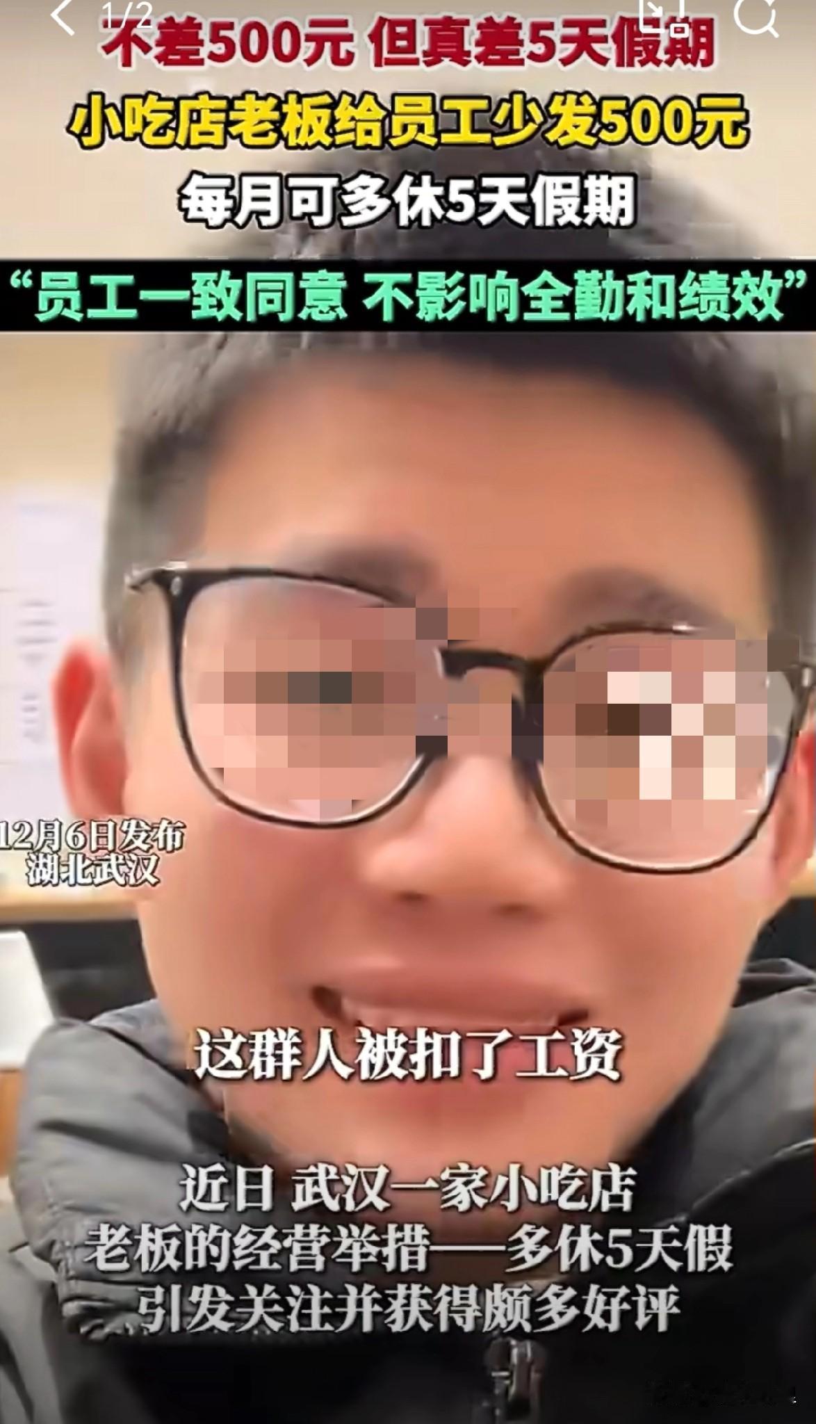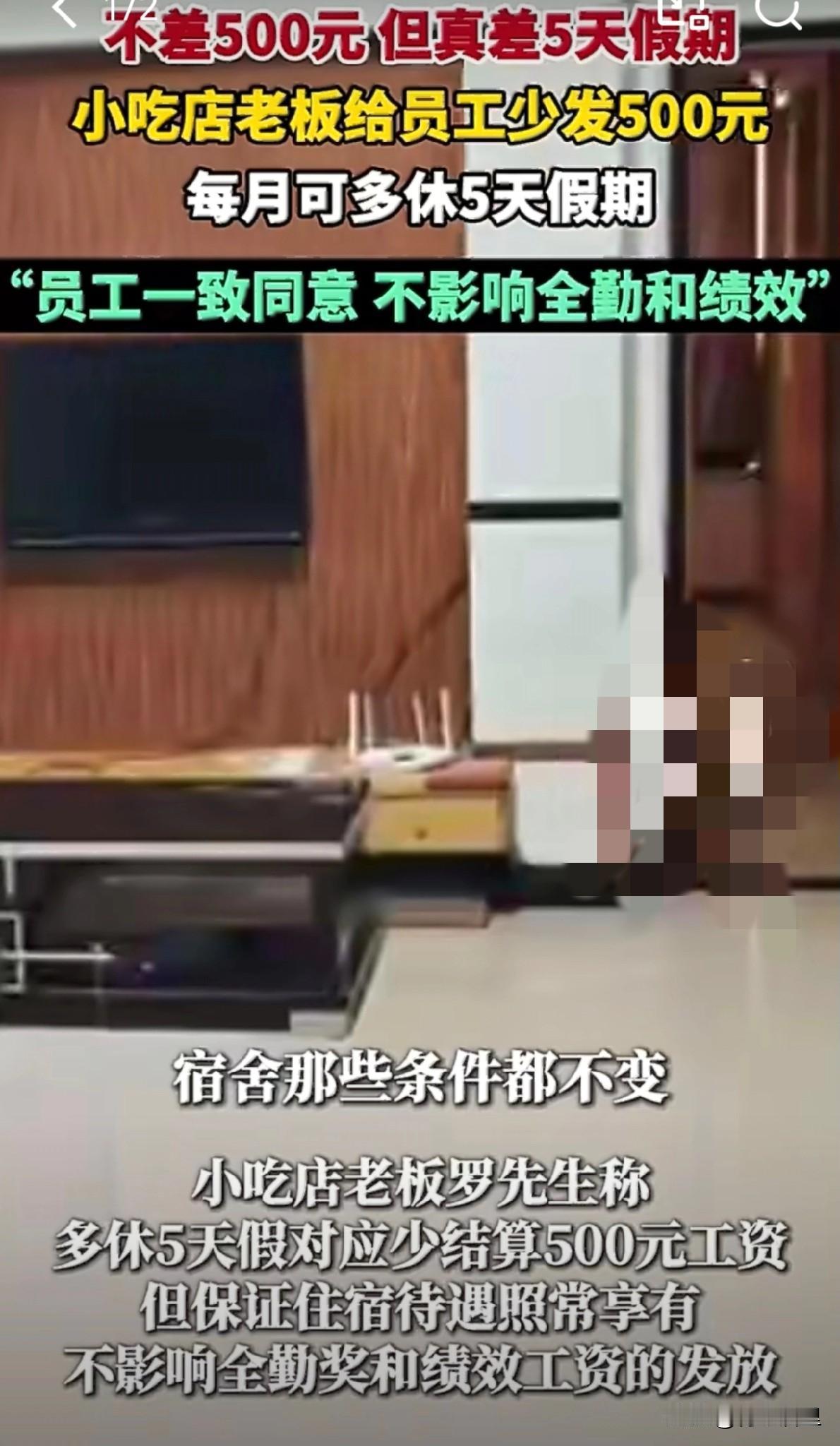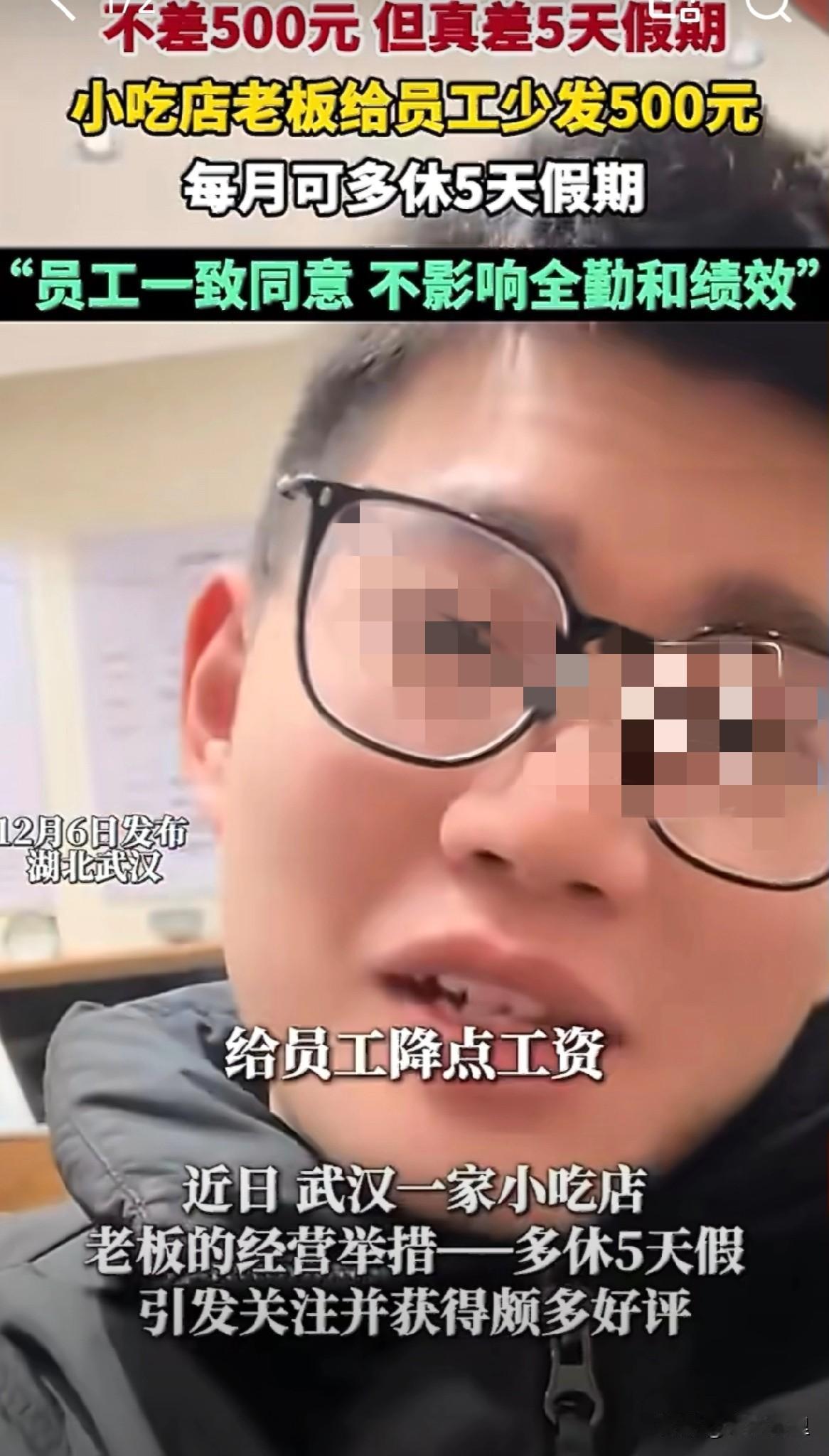 武汉一家小吃店的经营举措,最近广受好评。老板把选择权交给员工,每月可以多休五天,但少结算五百的工资。住宿、全勤和绩效等待遇照常享有。 现在的社会各种卷,加班是常态,很多人连完整的双休都不敢想。这样的制度无疑是给这个卷到缺氧的社会,开了扇透气的窗。 一个好的社会,也应该容得下这种‘选择’。不是非得996才算努力,也不是只有赚钱才算有价值。偶尔慢下来,才不只是在活着,而是在生活。 工资少拿五百,换十天自由。这样的工作,你愿意做嘛?