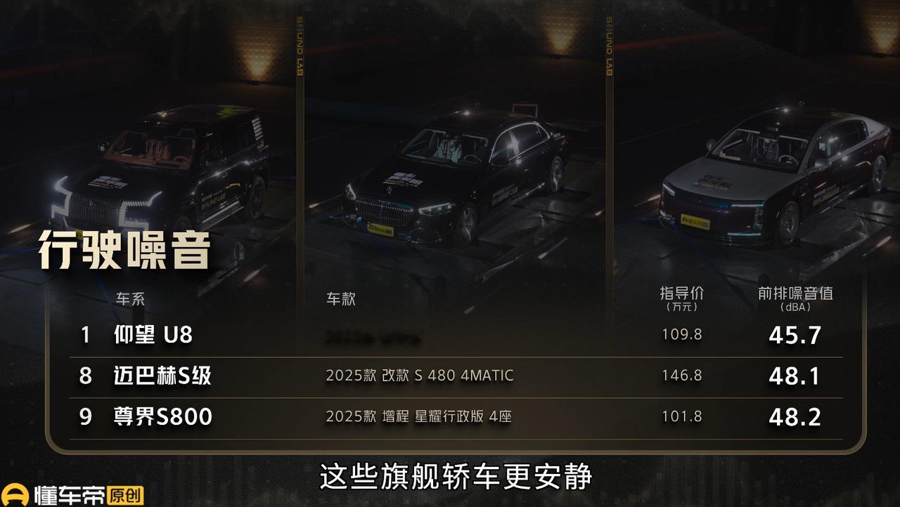 懂车帝50款热门车声音对比仰望U8 直接冲到☝🏻,本次测试中前排的行驶噪音只有