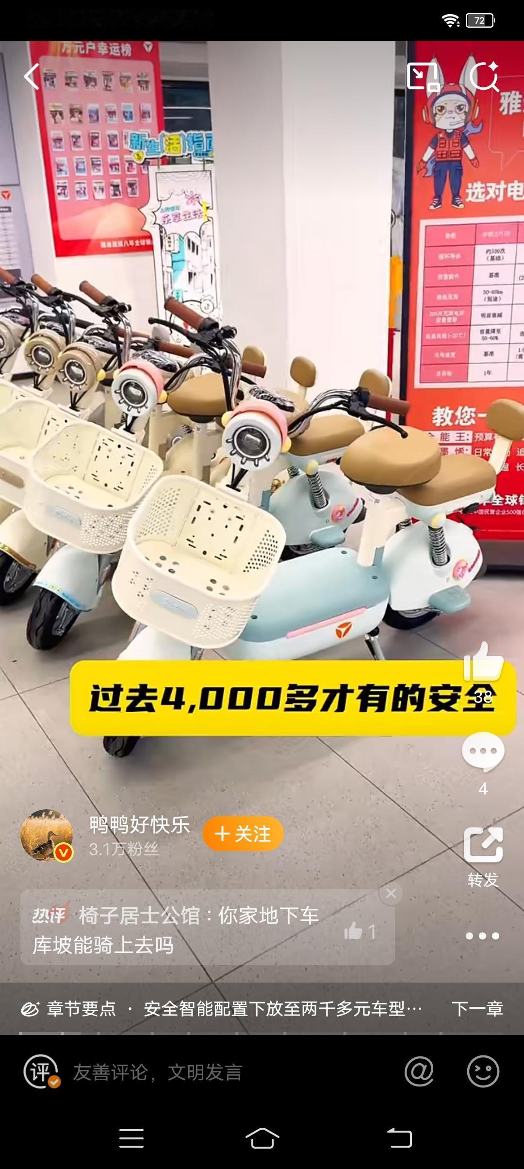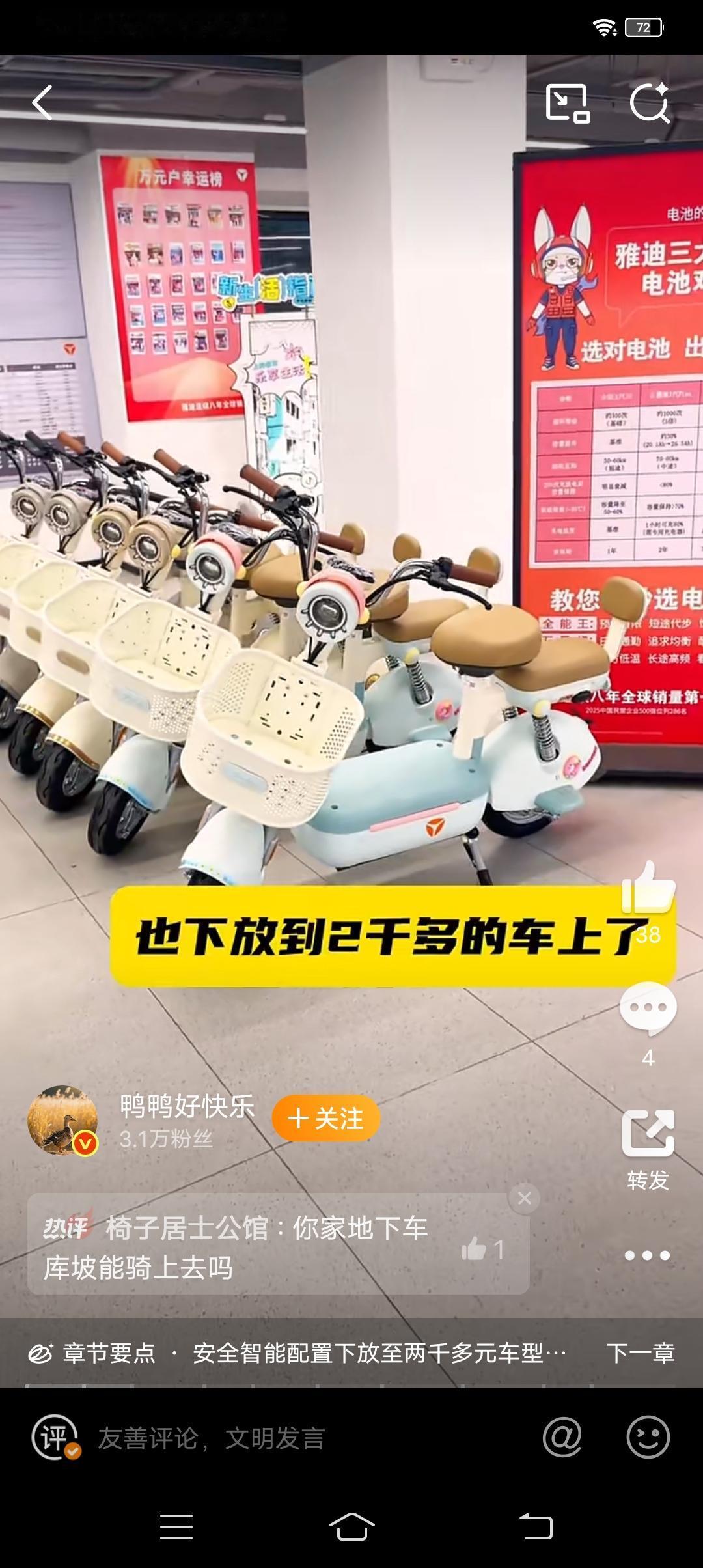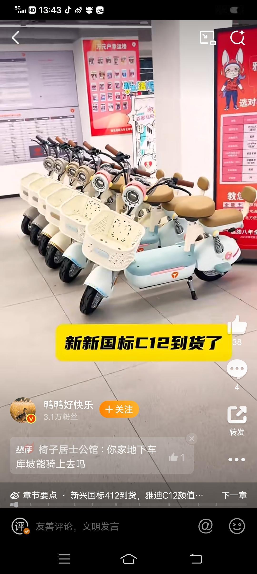 电瓶车卖家在直播间卖力宣传新到货的雅迪新国标C12电动车…… 卖点有很多,比如说原来4000多的配置,现在2000多就可以到了;后面也有两个坐垫了,买菜接娃都非常方便等等…… 可直播间的网友却表示:即便你吹的再如何天花乱坠,我就问你这种车子岁数大一点的老人从地下车库这个斜坡能开上来吗?摔一跤算谁的?动力太差,上个坡都费劲,谁会买?也不知道这些专家都是吃什么长大的? 各位网友,就新国标电动车这个话题,你有什么看法?