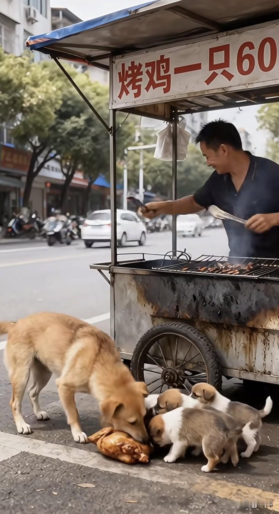 太感人了!这天一只可怜的狗妈妈带着几只小奶狗来到一家烤鸡摊前面,狗妈妈和孩子们已