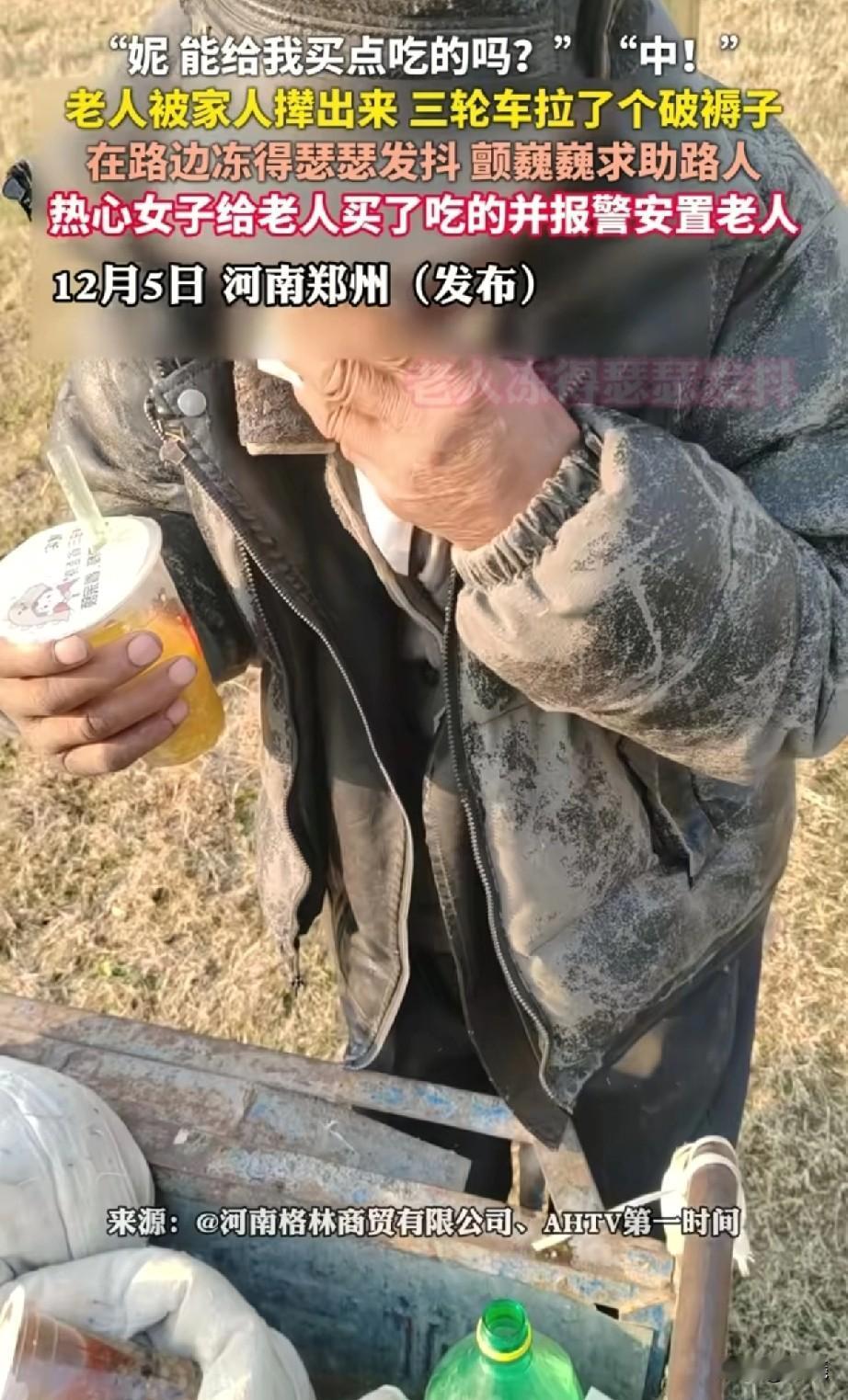 看哭了! 初冬的清晨,天气很冷,河南崔女士走在上班路上。 突然,一位瘦弱的老人拦住了她:我饿了,能给我买点吃的吗? 崔女士看着穿着单薄的老人,身体在微风中微微发抖,她迅速跑到附近早餐点给他买了吃的,还有热的粥类。 老人用冻得红肿的手拿着稀饭往嘴里送,他另一只手扶着自己那辆三轮车,而车上有一条破被子。 崔女士打量着老人,他视力好像不佳,看样子80岁左右,她不理解老人在这个时间能跟她讨吃的,于是一番询问。 老人说自己是被家人打出来的。昨天晚上在草坪上过了一夜,所以特别寒冷,又加上没有吃东西,所以难耐,不得已才向崔女士开口。 崔女士看着寒风中的老人,担心他吃不消,问他接下来还在草坪过夜吗,这可是冬天,年轻人都吃不消的,老人说接下来自己会去找个屋子住。 虽然这样说,但身无分文,又这么大年纪,不一定会有人愿意接纳他,崔女士考虑到老人的不方便,于是打电话报警,将老人接走进行安置,据说有关部门介入,会对老人的事情进行解决处理。 虽然现在是初冬,冷温度还是能接受,但对于这么大年纪的老人,在外面过夜,还真是让人担心,并且心疼,不知道老人说的话是否真实,他真的被家人打出来的吗? 如果真是这样,那他的儿女太不孝了,看老人状态,一生也是个操心的人,曾经为了家人为了生活付出过,但如今还没有享受晚年生活,这儿女也是心狠的人呐。 人的一生看起来好几十年,其实很短暂,一家人能生活在一起,那是缘分, 父母在孩子小的时候,再苦再累,都能咬牙把孩子抚养长大,盼着子女成家了,自己日子也好起来了,可这位老人的遭遇让人心寒。 不管怎样,希望老人儿女看到这个视频,赶快把老人接回去,好好赡养,因为自己也有孩子,自己也有老去那一天,不要让自己的行为成为孩子效仿的例子,你说呢?