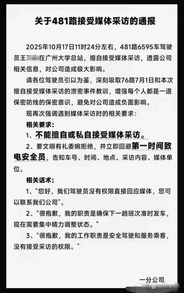 广州公交481路10月16日开始停运公示 10月17日应该是有媒体收到消息后去采访该线路司机,具体说了什么,也查不到了。 然后这位司机被该公司内部通报批评。 一般来说,大多数公司都会要求员工婉拒新闻媒体的直接采访,实在不行向上级汇报。 其实现在公交车上都张贴了服务投诉电话,这位司机只要引导那位媒体记者拨打热线电话就行了,话说多了都是泪!