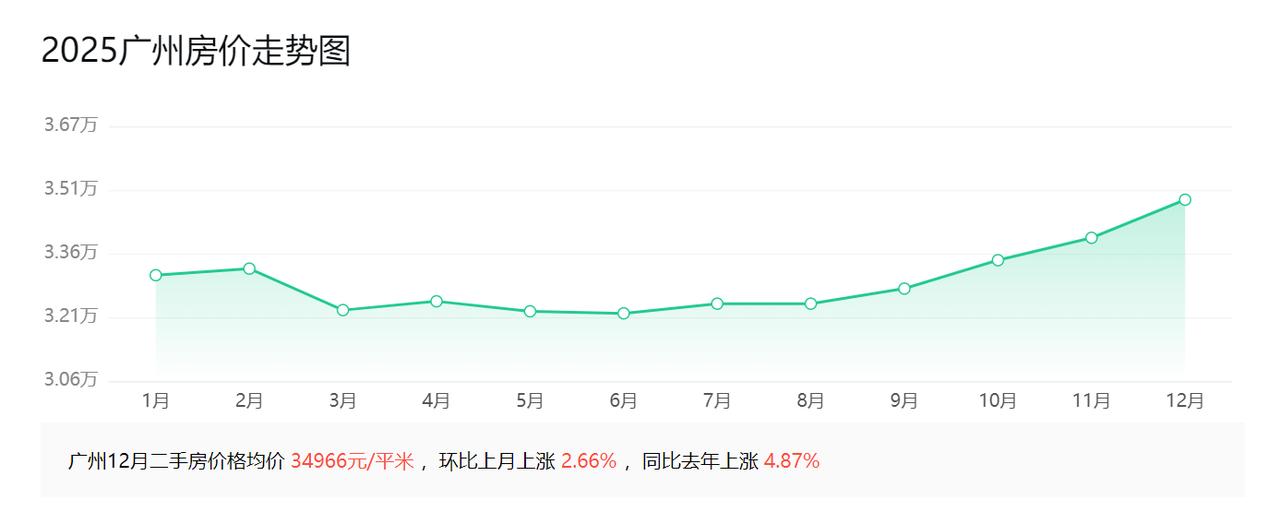 2025年1月,广州房价均价33167元; 2025年2月,广州房价均价33323元; 2025年3月,广州房价均价32335元; 2025年4月,广州房价均价32544元; 2025年5月,广州房价均价32306元; 2025年6月,广州房价均价32257元; 2025年7月,广州房价均价32488元; 2025年8月,广州房价均价32488元; 2025年9月,广州房价均价32847元; 2025年10月,广州房价均价33524元; 2025年11月,广州房价均价34058元。   2025年1-11月份,广州的房价小幅波动,但是整体微涨,2025年广州的房价整体比2022年的顶峰3.79万元下降了近3000多元。   有网友问漫心r,未来广州的房价会是多少,漫心r不敢做定论,但是可以明确的是,未来的房价一定是随着广州的经济发展和人口波动来决定的。2025年前三季度,广州GDP增长4.1%,2024年常住人口比2023年增加了15.1万人。   那么大家觉得呢?广州未来的房价会怎么发展?评论区聊一聊。