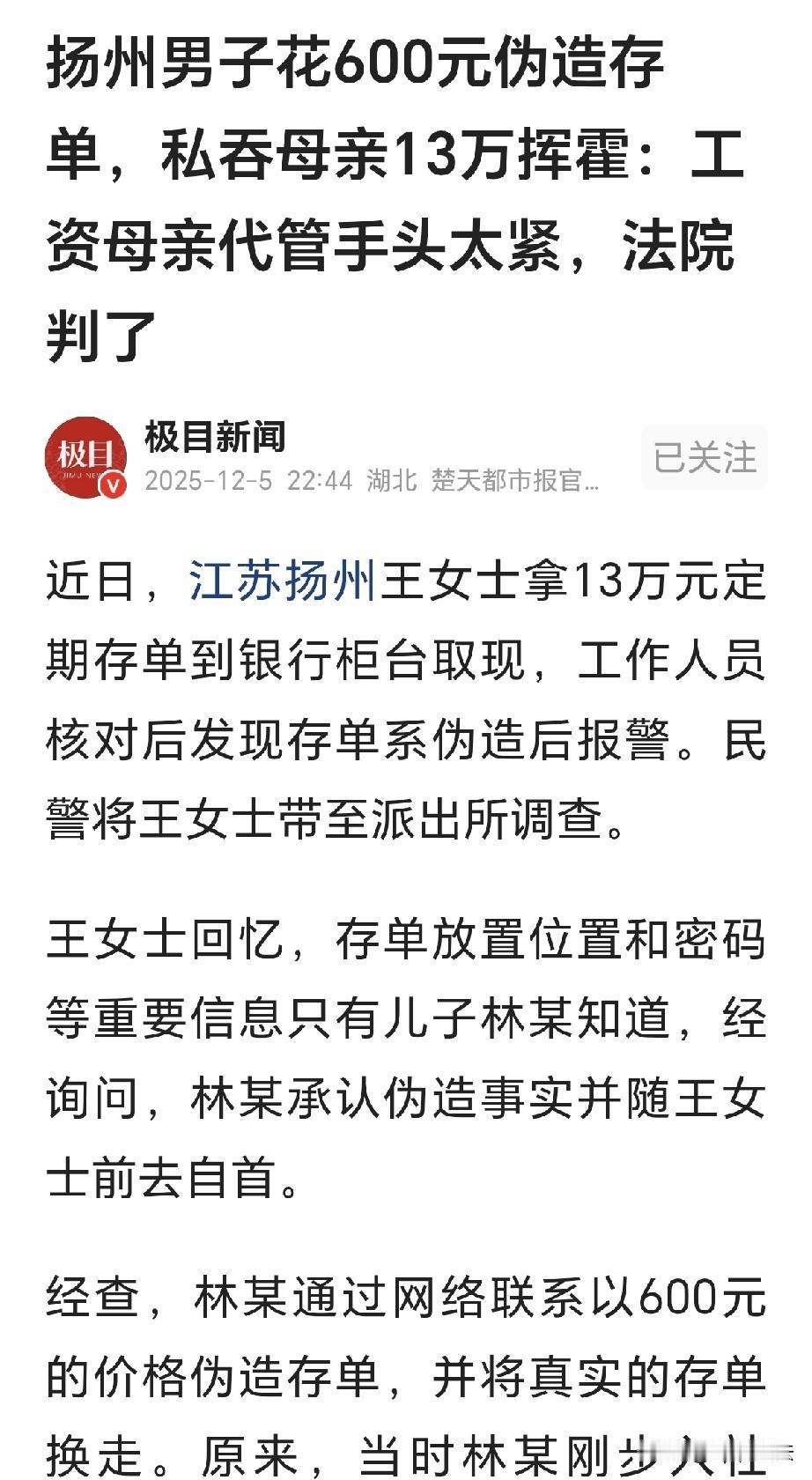 江苏扬州,一女子拿着13万存折到银行取现,谁知银行发现,存折是假的,银行报警,女子表示,家里的存折密码,只有她儿子知道,儿子不可能偷她的钱,警方找到儿子,儿子说了句话,令女子后悔莫及! 王女士拿着自己的定期存单,存单上一共有13万元,她兴高采烈来到银行,她一路上琢磨,这次她要全部取现。 等她来到银行柜台,直接就把存单递了进去,谁知银行的工作人员接过存单,一下就感觉到存单不对劲。 工作人员核对信息,又反复查验存单的纸质、印章和防V标识。 到了最后,工作人员确定,这是一张伪造的存单!银行立刻报警! 王女士蒙圈,她压根不知道发生了什么,警方赶到后将她带走调查,王女士一头雾水,自己的存单怎么可能是假的? 她努力回忆每一个细节,她告诉警方,自己的存单放在哪里,密码多少,就只有她和儿子知道。 可是她想不通,觉得自己的儿子总不可能会拿走这一笔钱用。 随后,王女士回到了家里,她叫来儿子,仔细问了这一件事,谁知儿子怕了,直接承认存单确实是他伪造的。 王女士惊掉了下巴,自己的儿子为何会做这样的事情?她立刻带着儿子到警方自首。 原来,王女士这一辈子,生活过得十分的节俭,她抠抠搜搜,每一分钱都计划着花。 在她心里,日子都是苦过来的,手里只有多攒些钱,以后才是生活的底气。 王女士省吃俭用,好不容易攒下13万元,她满心的高兴,立刻就到银行存了个定期。 有这笔垫底,她的生活就有了希望,她还有个儿子,儿子如今也已经长大。 看着儿子高大的背影,王女士心里有了些许的欣慰,能把儿子养大,她也费了九牛二虎之力。 她从小就教育儿子,述说着生活的不易,她日夜灌输,儿子耳晕目染,也就早早有了这样的意识。 儿子辛苦学习,好不容易熬到了毕业的日子,他曾经踌躇满志,希望通过自己的工作,能给母亲带来更好的生活。 谁知他刚出校门,踏入了she会,他能找到的工作,薪水都没有想象中那么的多。 可是尽管如此,第一次发工资时母亲就给他立下了规矩。 王女士怕他乱花,不知节制,提出以后要帮儿子保管工资。 儿子没有多想,他还是妈妈的宝贝,妈妈的话他言听计从,从来没有觉得有什么不对。 可是随着时间的推移,儿子发现,母亲每个月给他留的那点生活费根本就不够使用。 他在班上,从不参加同事之间的聚会,别人请上一次,你势必也要回请一次,人情世故,到处都是需要花钱的地方。 同事们会谈旅游,或者对自己爱好的投资,谁谁谁又买了部最新款的手机,谁谁谁又买了一件名牌上衣…… 他看着同事们有的开着自己的车,有的会在周末结伴出行,有人对他发出邀请,而他总是会找借口拒绝和别人出去。 时间一长,儿子成了孤家寡人,他无法融入团体,更没有一个朋友,别人看他抠搜,没有一个人愿意理他。 他想问母亲多要点钱,可是母亲总是要他节俭着用。 母亲的理由很是简单,你以后要买房结婚,现在不存钱到时候就会抓瞎,我们家就是普通家庭,一分钱就是要掰成两半花。 王女士虽然说着狠话,可是她又觉得自己年纪大了,家里的存折密码,她早就向儿子交代,就怕自己万一有个好歹。 谁知儿子林某默默的记在了心里,他在心里已经不再认同母亲的说法。 外面的世界是那么的精 彩,朋友同事们的生活早就令他心驰向往。 他们上班努力的工作,获得的收入就是要改善自己的生活,他们喜欢什么就会购买,他们会取悦自己,过好每一个当下。 林某回视自己的生活,手机已经老旧,身上穿的也是几年的衣服,他不甘心,忍不住动起了心思。 他脑子一热,不如把母亲的真存单偷出来取了钱,再伪造一张假存单放回去。 于是他在网上,花了600元整,果然伪 造了一张假的存折,他把真的存单换走,然后把13万元全部取出。 之后他疯狂花销,购买自己想要的物品。 很短的时间内,他就把13万元挥霍一空,他就像刹不住的水闸,这种随意花钱的滋味令他手舞足蹈。 可怜王女士一直被蒙在鼓里,一直到存折到期,这才拿着假存折去银行取现。 真相大白,王女士的儿子被送上的法庭,王女士更是后悔莫及,后悔没能早点就和儿子沟通。 《刑法》第177条第1款第2项规定: 伪造、变造委托收款凭证、汇款凭证、银行存单等其他银行结算凭证的,构成伪 造、变 造金融 票 证罪。 林某为套取母亲的13万元存款,特意花费600元V造对应金额的银行存单,还替换掉真实存单,属于典型的伪 造银行结算凭证行为。 银行存单是金融结算的重要凭证,其真实xing是金融秩序稳定的基础。 林某的不仅欺骗了母亲,更破坏了金融票证管理制度,并非单纯的家庭内部纠纷。 法院考虑到林某在家人陪同下主动投案且如实供述罪行,构成自首,同时自愿认罪认罚,因此对其从轻处罚。 最终法院判决,林某以伪造金融票证罪,拘役3个月,缓刑3个月,并处罚金20000元。 对此,你怎么看? 关注@王哥说法 多学法律少吃亏!