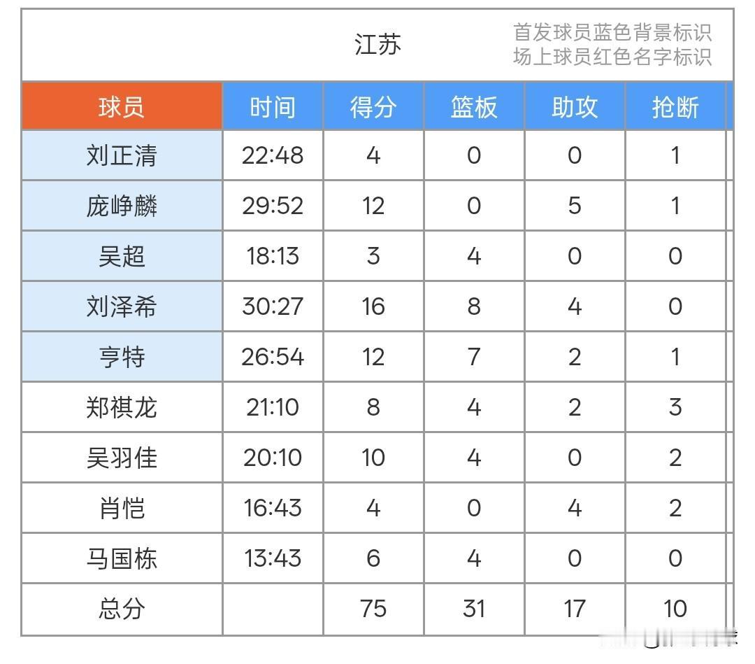 广东101-75大胜江苏,徐杰18+8,庞峥麟12分5助攻。 CBA俱乐部杯,广东队101-75大胜江苏队,这是一场实力悬殊的较量,第一节双方比分还能僵持,广东队第二节打出28-14拉开分差,广东队前三节已经领先17分,末节又用一波23-14锁定胜局。 广东队篮板球优势明显,但三分球只有34投7中,全队五人得分上双,徐杰18分4板8助全队最高,萨林杰9分7板,萨姆纳12分5板,首发出场的奎因8分4板。 江苏队单外援出战,庞峥麟12分5助攻,刘泽希16分8板,亨特12分7板,江苏四人得分上双。庞峥麟是比赛的最大看点,这是NBL的明星球员,在CBA的表现尚可。