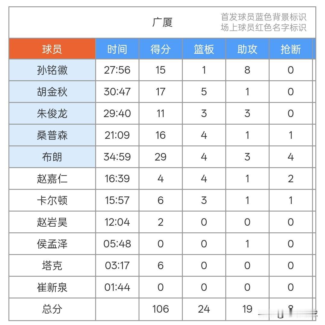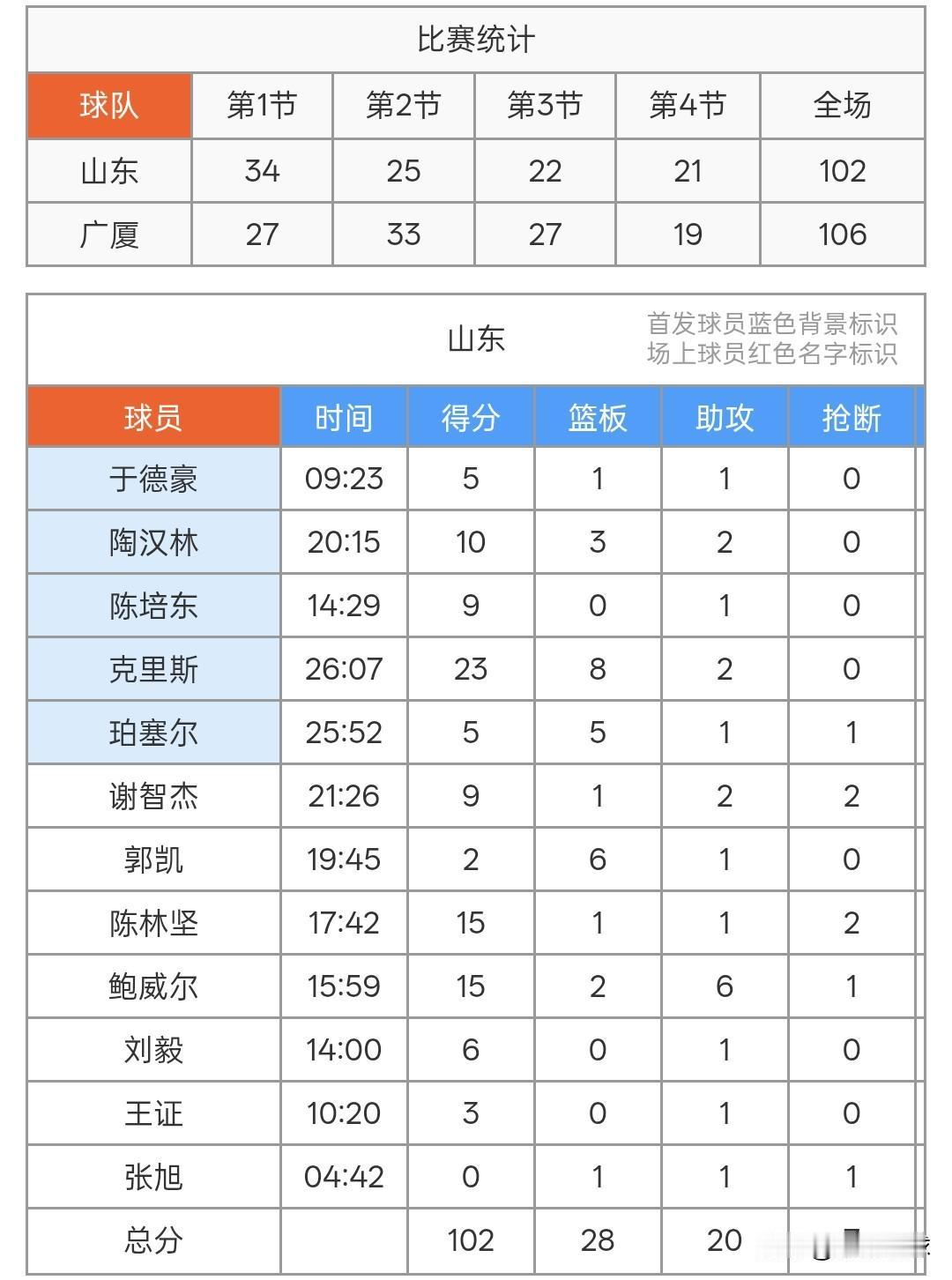 首发五人上双,广厦106-102战胜山东。 CBA俱乐部杯广厦106-102战胜山东,山东队帕塞尔和克里斯双外援首发第一节就砍下34分,广厦队桑普森和布朗先发第二节回敬一个33-25,半场结束广厦60-59领先。 第二节孙铭徽表现强势单节砍下9分,广厦带着6分优势进入最后一节,最后两分钟山东队追到98-100,广厦先是两罚全中,桑普森再下两分锁定胜局,广厦106-102山东。 山东队三分球25投13中命中率超过50%,陈林坚在外线3中3,陈培东也是3中3,广厦队三分球24投11中同样也是高命中率,朱俊龙三分球33,布朗三分线外12投5中。 广厦队布朗29分4板3助4断、胡金秋17分5板、桑普森16分4板、孙铭徽15分8助、朱俊龙11分3板3助、卡尔顿6分3板、塔克6分、赵嘉仁4分4板2断。 山东队克里斯23分8板、鲍威尔15分6助、陈林坚15分、陶汉林10分3板、谢智杰9分、陈培东9分、刘毅6分、珀塞尔5分5板、于德豪5分、郭凯2分6板