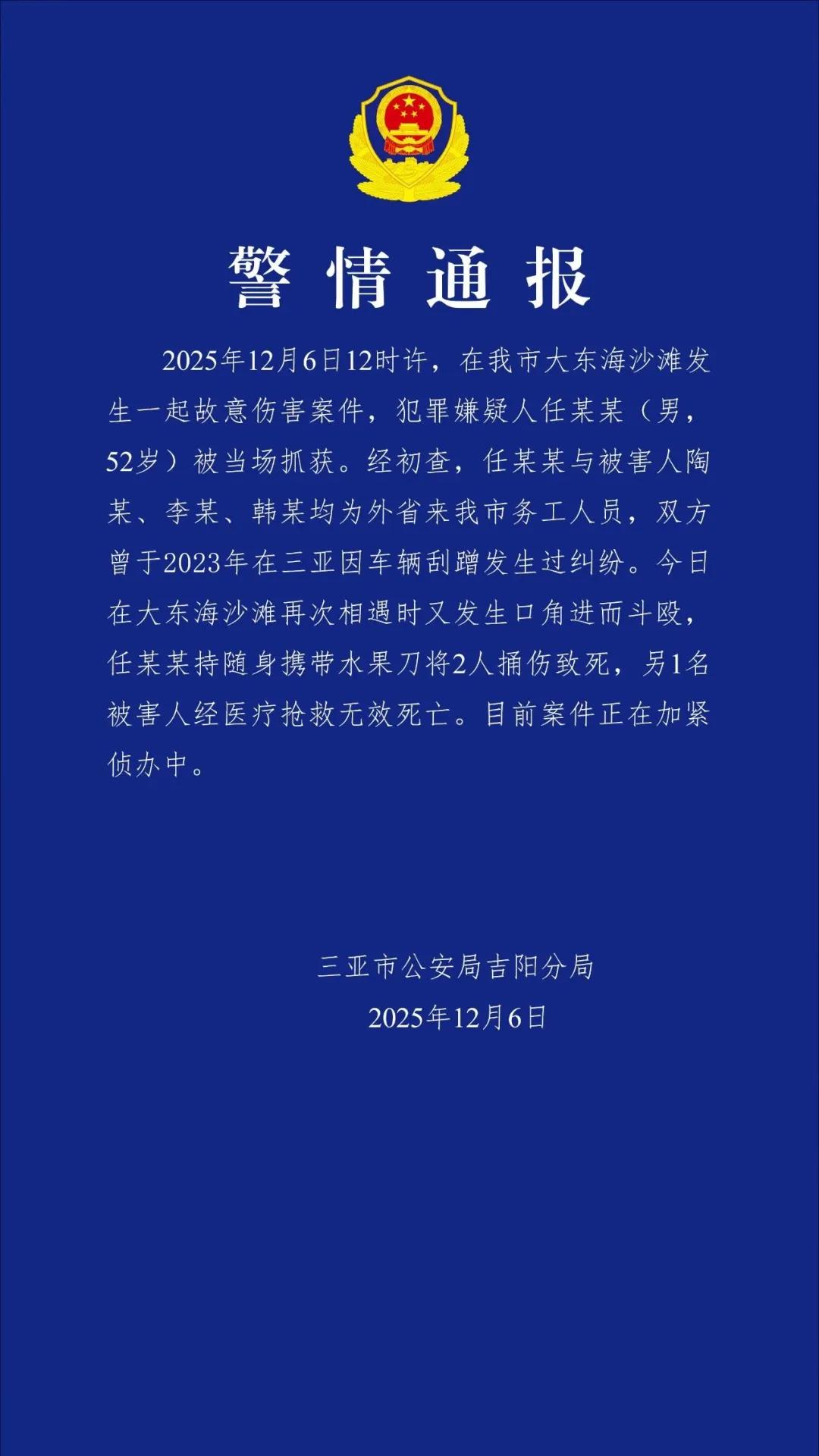 经初查,任某某与被害人陶某、李某、韩某均为外省至三亚市务工人员,双方曾于2023年在三亚因车辆剐蹭发生过纠纷。今日在大东海沙滩再次相遇时又发生口角进而斗殴,任某某持随身携带水果刀将2人捅伤致死,另1名被害人经医疗抢救无效死亡。