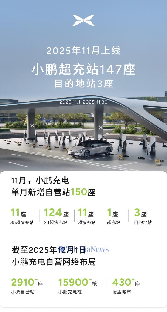 12月6日,小鹏汽车宣布2025年11月新增自营站150座,S5超快充站11座,S4超快充站124座,超快充站11座,超充站1座,目的地站3座。