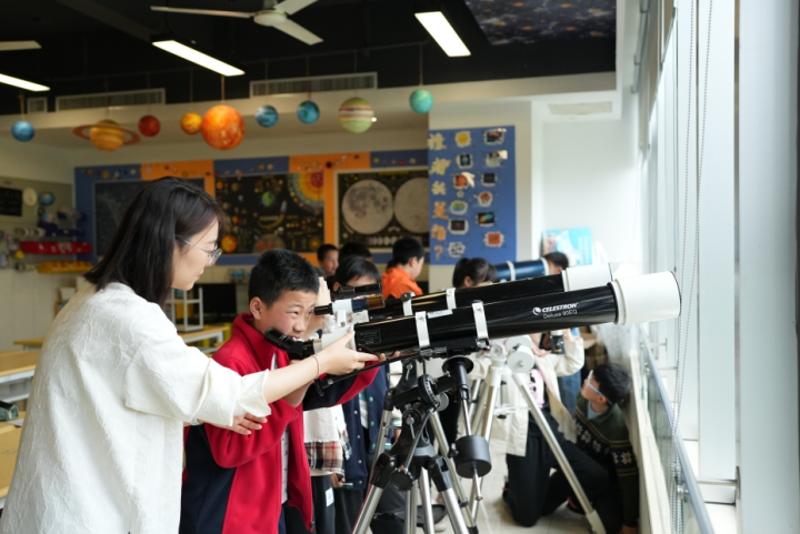 “刚开课时,我们就打破教室围墙,带着同学们参加浙江省天文学会的‘七星连珠’观测活动,用天文望远镜观测星星。”周老师说,天文课有时在天象厅上,同学们喜欢躺下,一边看星空一边听她讲解,有孩子说特别解压。