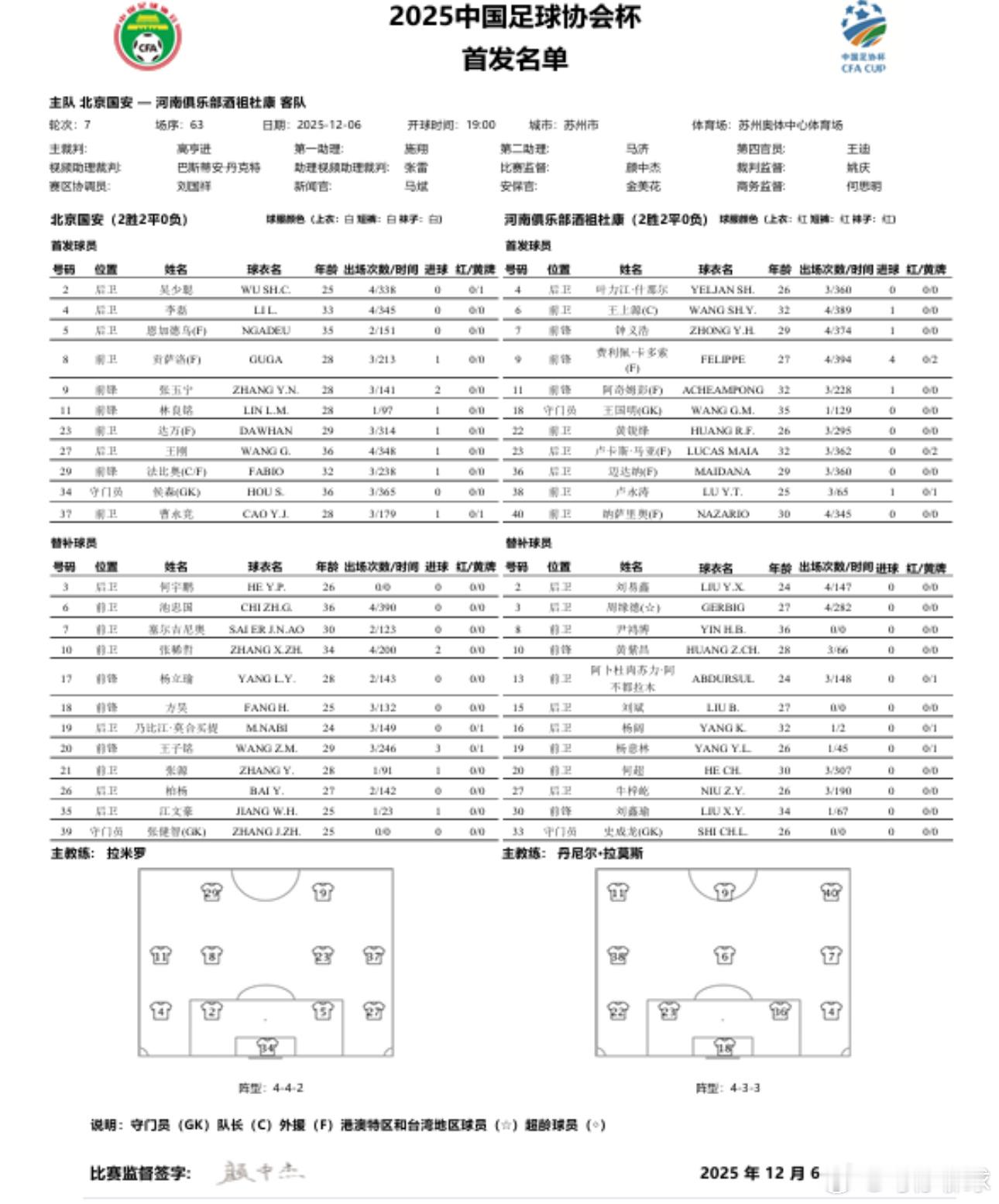 12月6日讯 2025足协杯决赛,北京国安与河南队在苏州奥体中心体育场争夺冠军。赛前,两队首发阵容出炉!北京国安vs河南队中超联赛北京国安vs河南队悬念拉满 北京国安首发:34-侯森、4-李磊、2-吴少聪、5-恩加德乌(F)、27-王刚、11-林良铭、8-贡萨洛(F)、23-达万(F)、37-曹永竞、29-法比奥(F)、9-张玉宁河南队首发:18-王国明、22-黄锐烽、23-卢卡斯·马亚(F)、36-迈达纳(F)、4-叶力江、38-卢永涛、6-王上源、7-钟义浩、11-阿奇姆彭(F)、9-卡多索(F)、40-纳萨里奥 (F)