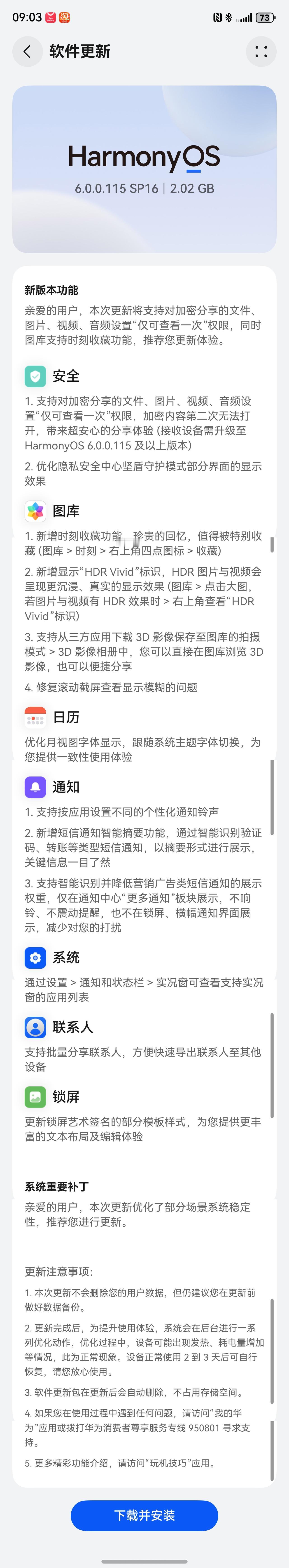 朋友们,华为HarmonyOS 版本推送6.0.0.115SP16|2.02 GB 新版本功能: 亲爱的用户,本次更新将支持对加密分享的文件、图片、视频、音频设置"仅可查看一次"权限,同时图库支持时刻收藏功能,推荐您更新体验。 安全: 1.支持对加密分享的文件、图片、视频、音频设置"仅可查看一次"权限,加密内容第二次无法打开,带来超安心的分享体验(接收设备需升级至 HarmonyOS 6.0.0.115及以上版本) 2.优化隐私安全中心坚盾守护模式部分界面的显示效果 图库 新增时刻收藏功能,珍贵的回忆,值得被特别收藏(图库>时刻>右上角四点图标>收藏) 2.新增显示" HDR Vivid "标识, HDR 图片与视频会呈现更沉浸、真实的显示效果(图库>点击大图,若图片与视频有 HDR 效果时>右上角查看" HDR Vivid "标识) 等等功能。