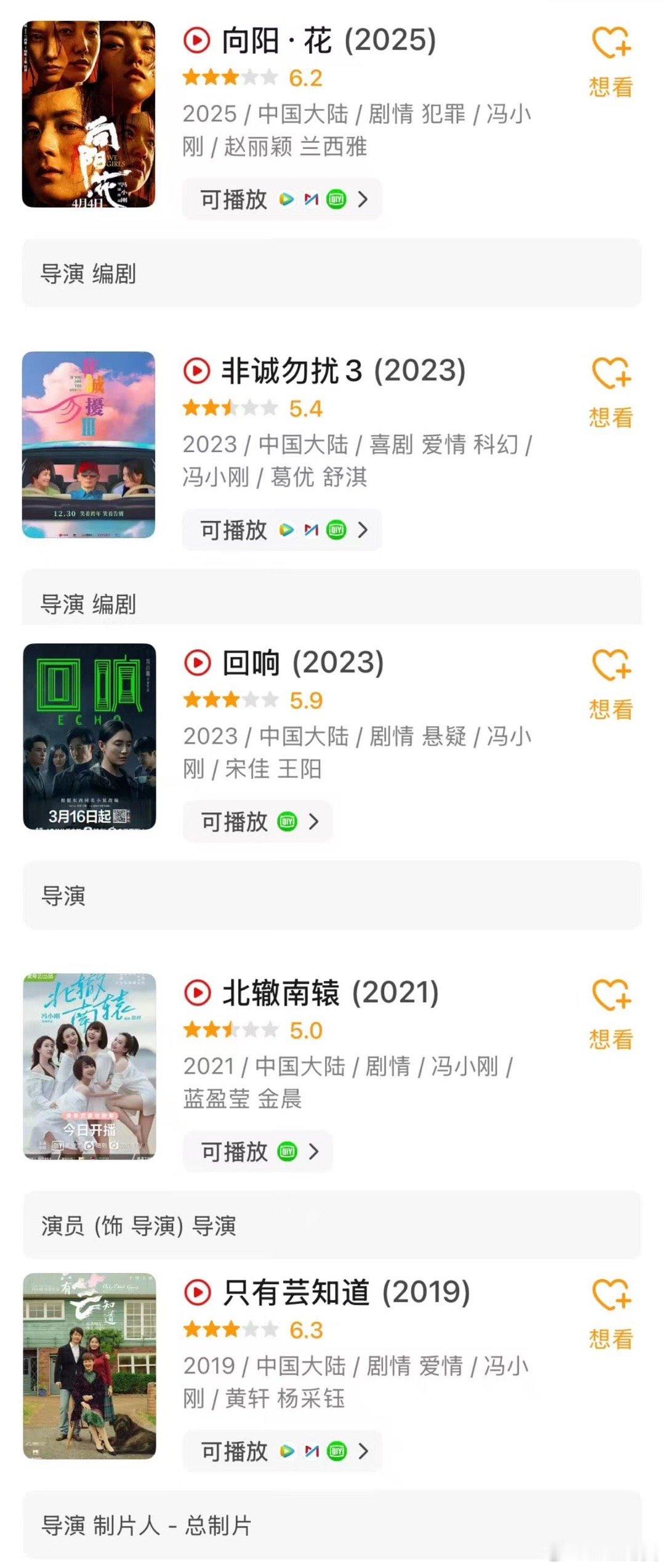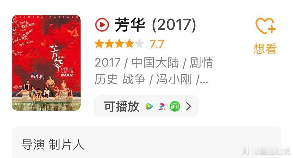 芳华芳华解说 《芳华》是冯小刚作为导演的最后辉煌。《芳华》票房14.22亿,是冯小刚电影作品中票房最高的。《芳华》之后,冯小刚导演的影视作品豆瓣评分再也没有7.7分或以上的了。《芳华》之后,冯小刚的大部分作品都是6分多,甚至还有5分多的。票房也没有超过2.5亿的。尤其是曾经大热的《非诚勿扰》这个IP,第三部票房勉强破亿。《抓特务》有没有可能在票房、口碑上让冯小刚导演打个“翻身仗”呢?让冯小刚导演辉煌再现呢?!冯小刚是内地电影市场贺岁档的开山鼻祖,当年一部《甲方乙方》让红红火火的贺岁档延续了很多年哦。