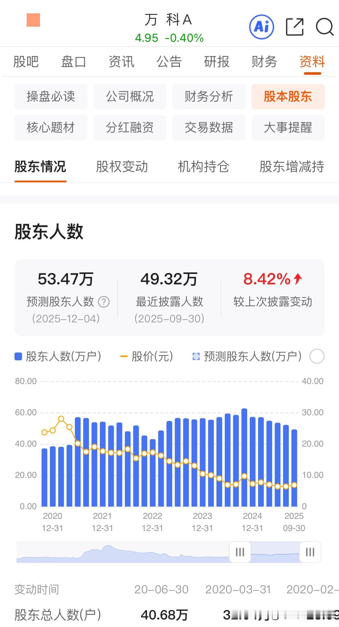 连跌4年半,跌幅超80%!万科的底究竟在哪儿? 要说今年最痛苦的股民,应该非万科莫属了! 在今年之前,万科已经连续下跌了整整4年时间,市值也从4千亿跌到了今年年初的不足千亿,4年时间跌幅超过7成! 万科的这一波下跌起源于2021年3月份,当月万科下跌10%,而对应股东人数为39.4万户!但随着万科一路下跌,到了当年6月底,万科的股东人数已经迅速膨胀到了史无前例的58万户,这意味着有大量散户在抄底万科! 此后万科的股东人数就稳定在了50万左右,这要么是随着万科的大幅下跌,里面的散户干脆躺平了;要么就是有散户割肉了,又有新的抄底的散户冲了进去! 直到去年9·24行情的到来,万科的股价才终于迎来了转机,当月大涨近44%,一度让里面的散户看到了曙光! 可没想到这不过是回光返照而已,此后其又一路下跌,即便是在今年4月份之后的牛市行情中,万科的股价也毫无起色!尤其是最近三个月更是连续破位下跌,股价也是屡创新低! 12月5日,万科的股价再次创下收盘新低,收盘价仅有4.95元,而市值也仅剩下了590亿!想必里面的散户应该是早已破防,不过更多的应该是已经躺平了! 都说下跌不言底,果然如此,即便是当年浓眉大眼的万科也不例外! 虽然说万科的底不知道在哪里,但据我所知,当年因为投资万科而享誉投资界的刘元生似乎早在2020年以前就已清仓了万科!