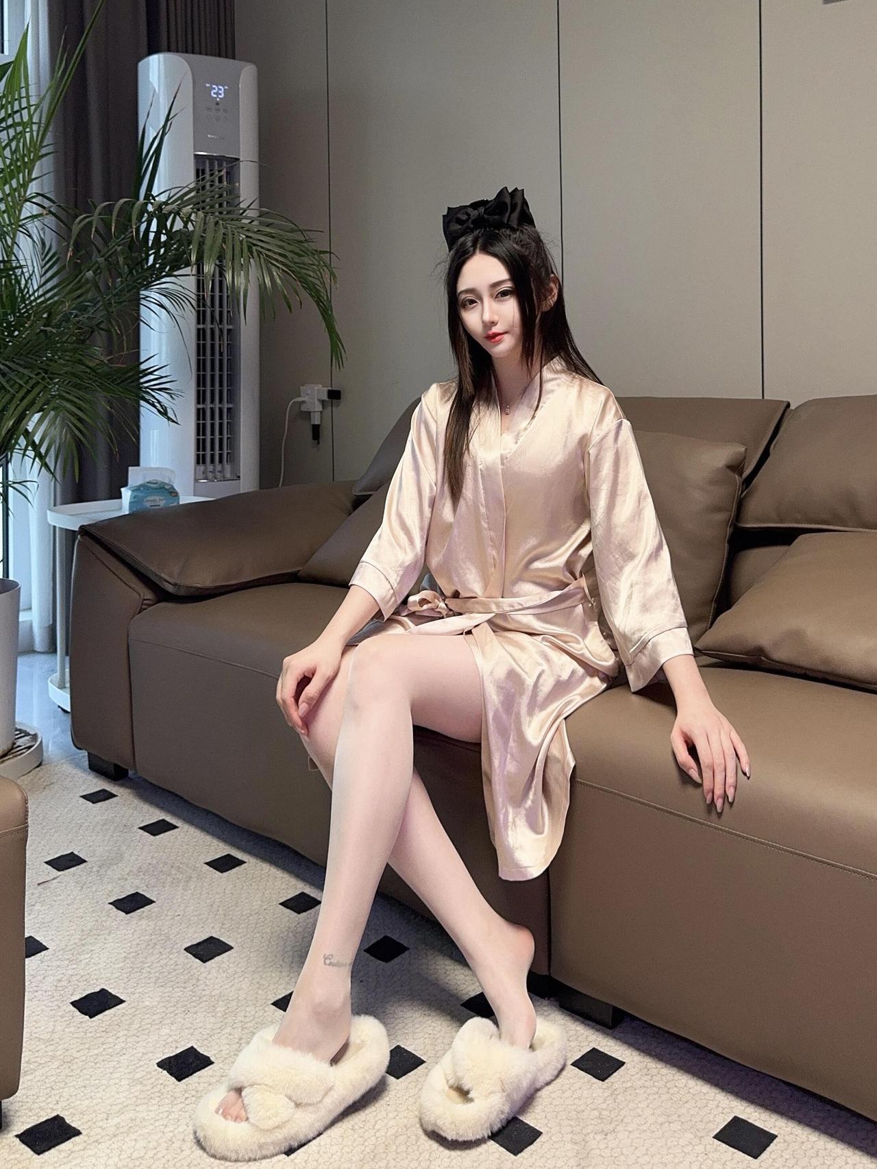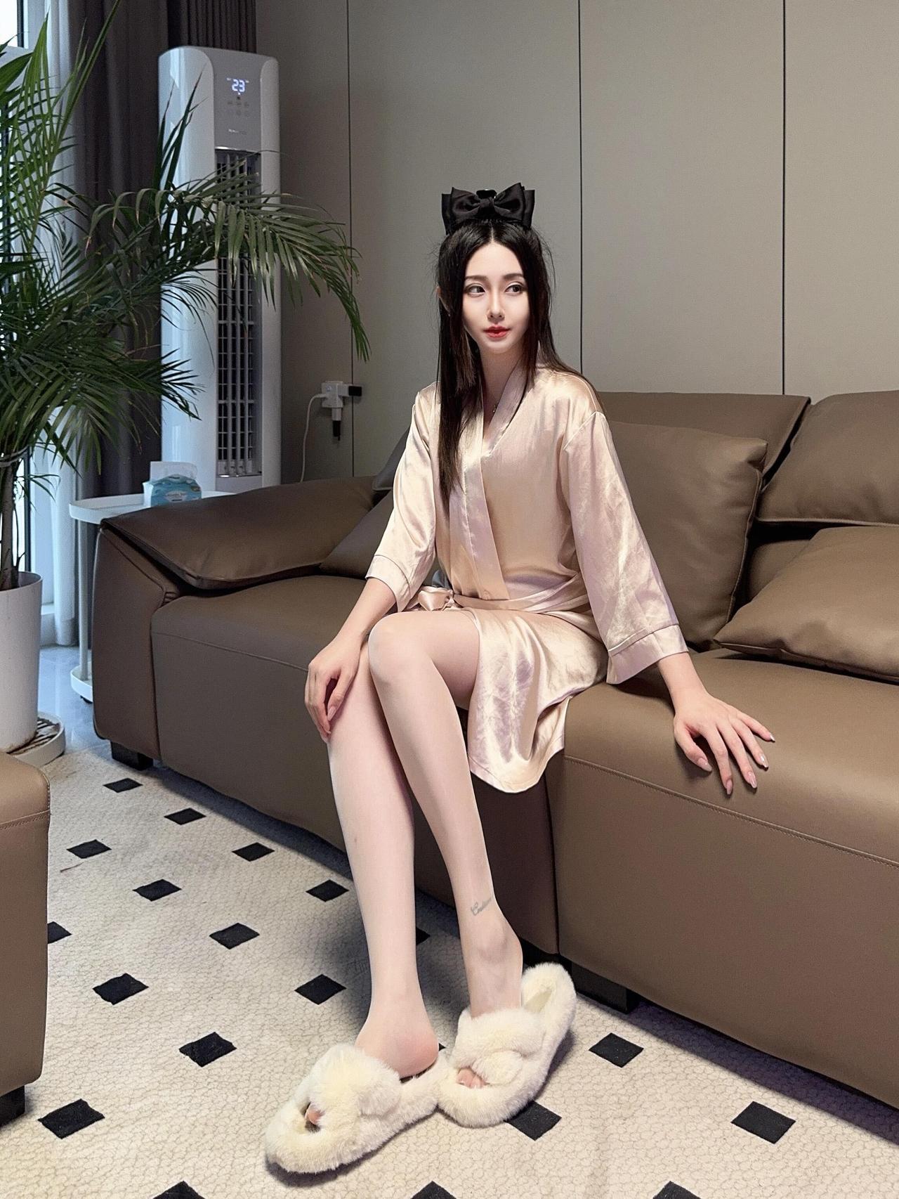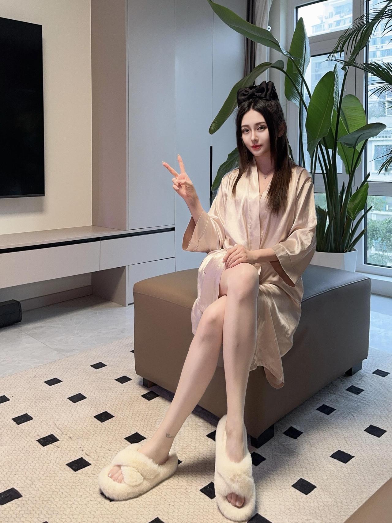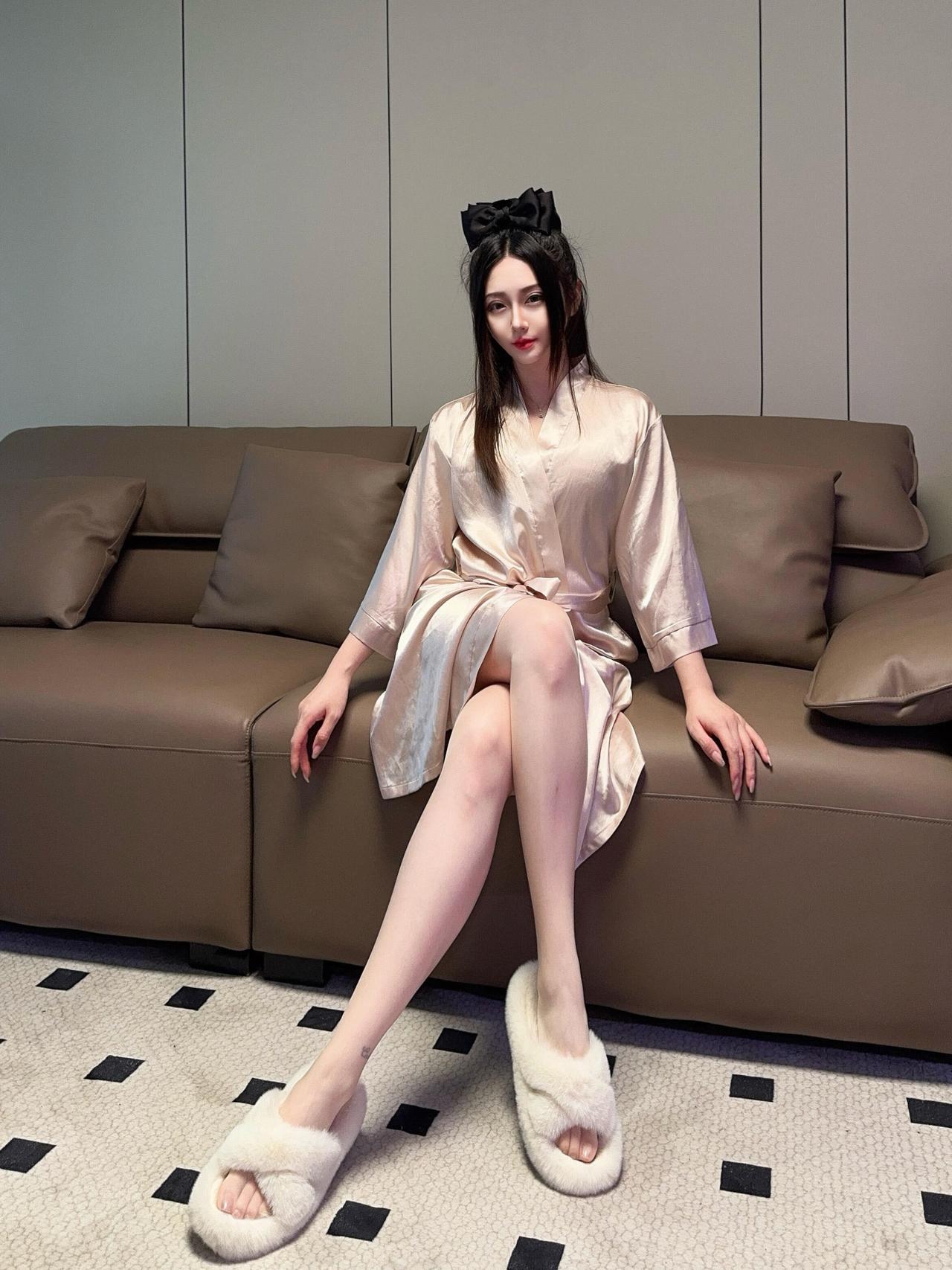 居家慵懒风,丝质睡衣与毛绒拖鞋的完美搭配! 居家毛绒拖鞋 毛绒拖鞋穿搭 居家凉