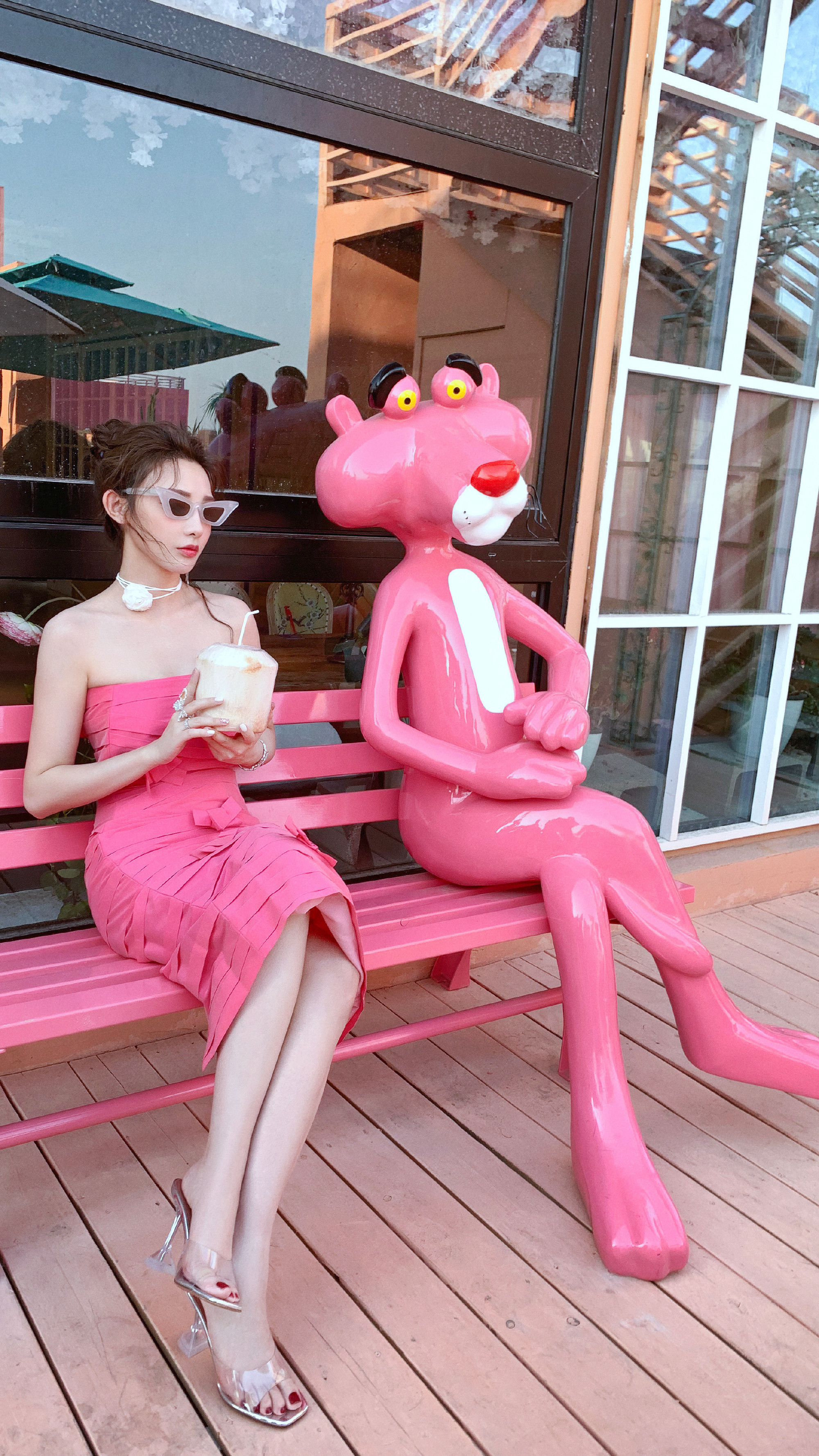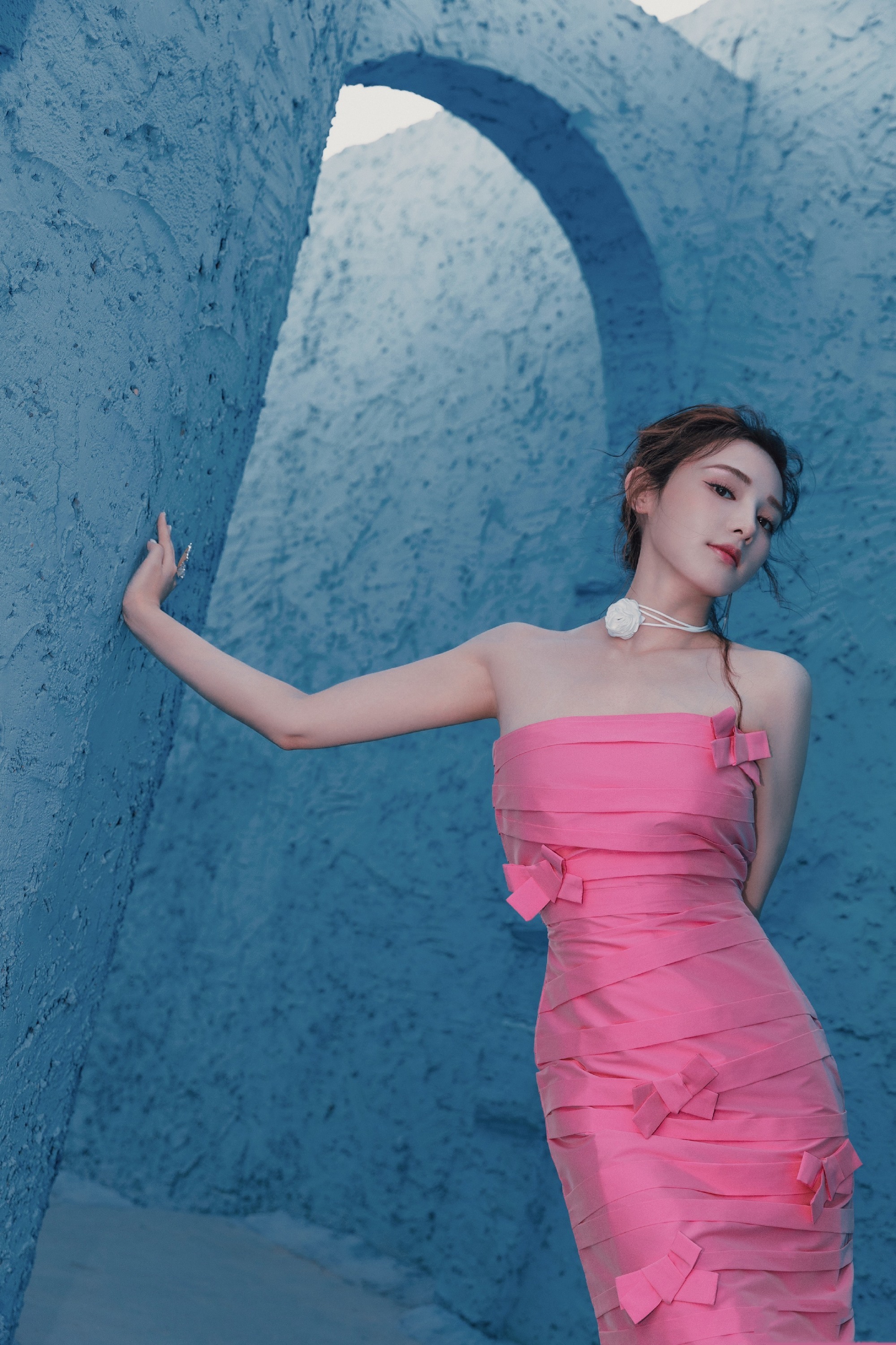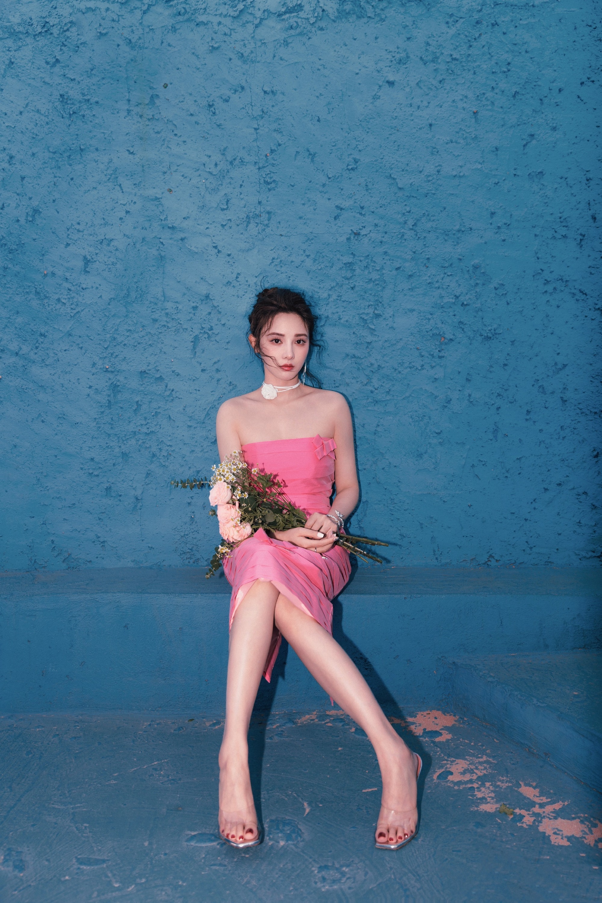 彭小苒,撞色多巴胺穿搭:粉红抹胸裙优雅迷人。彭小苒