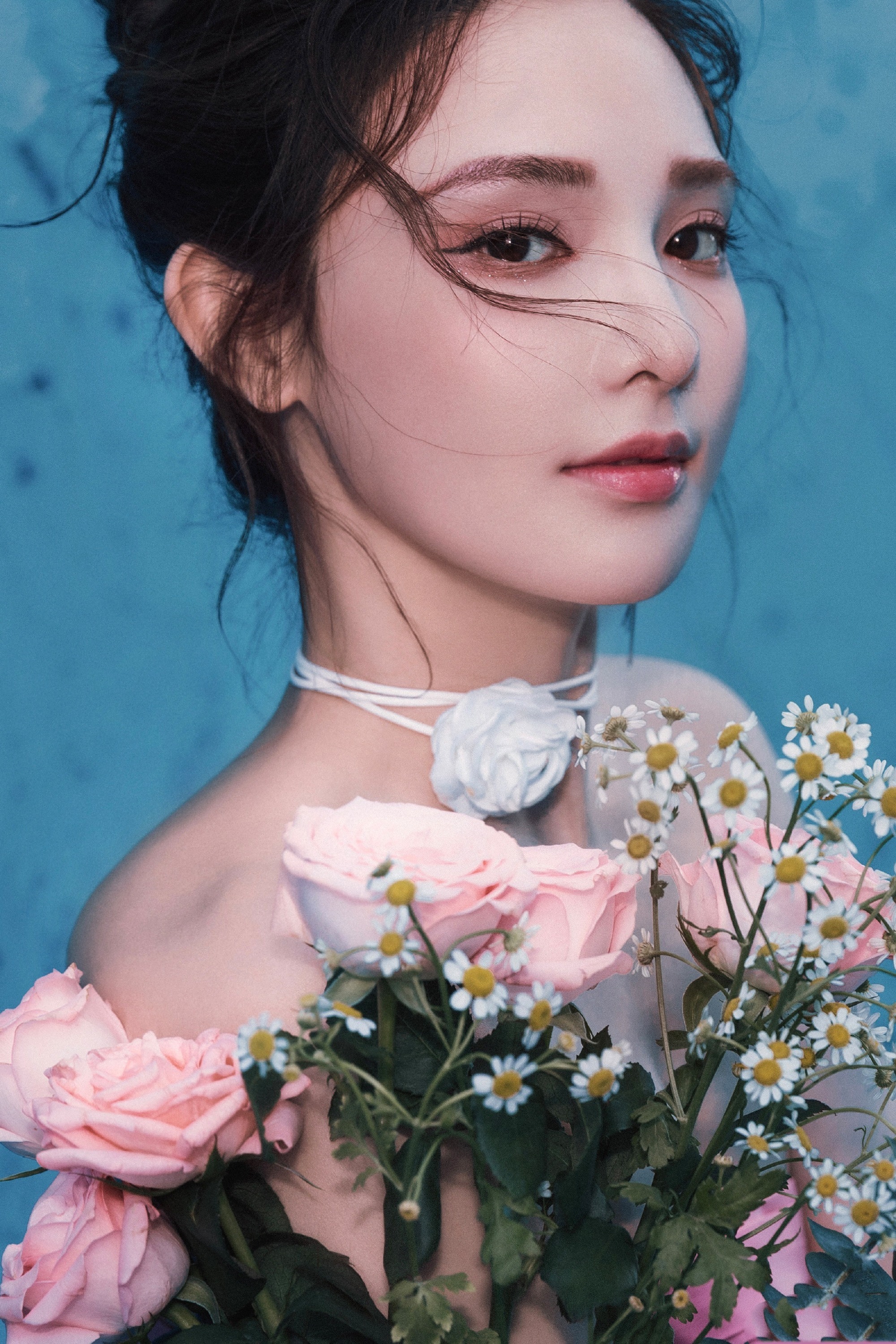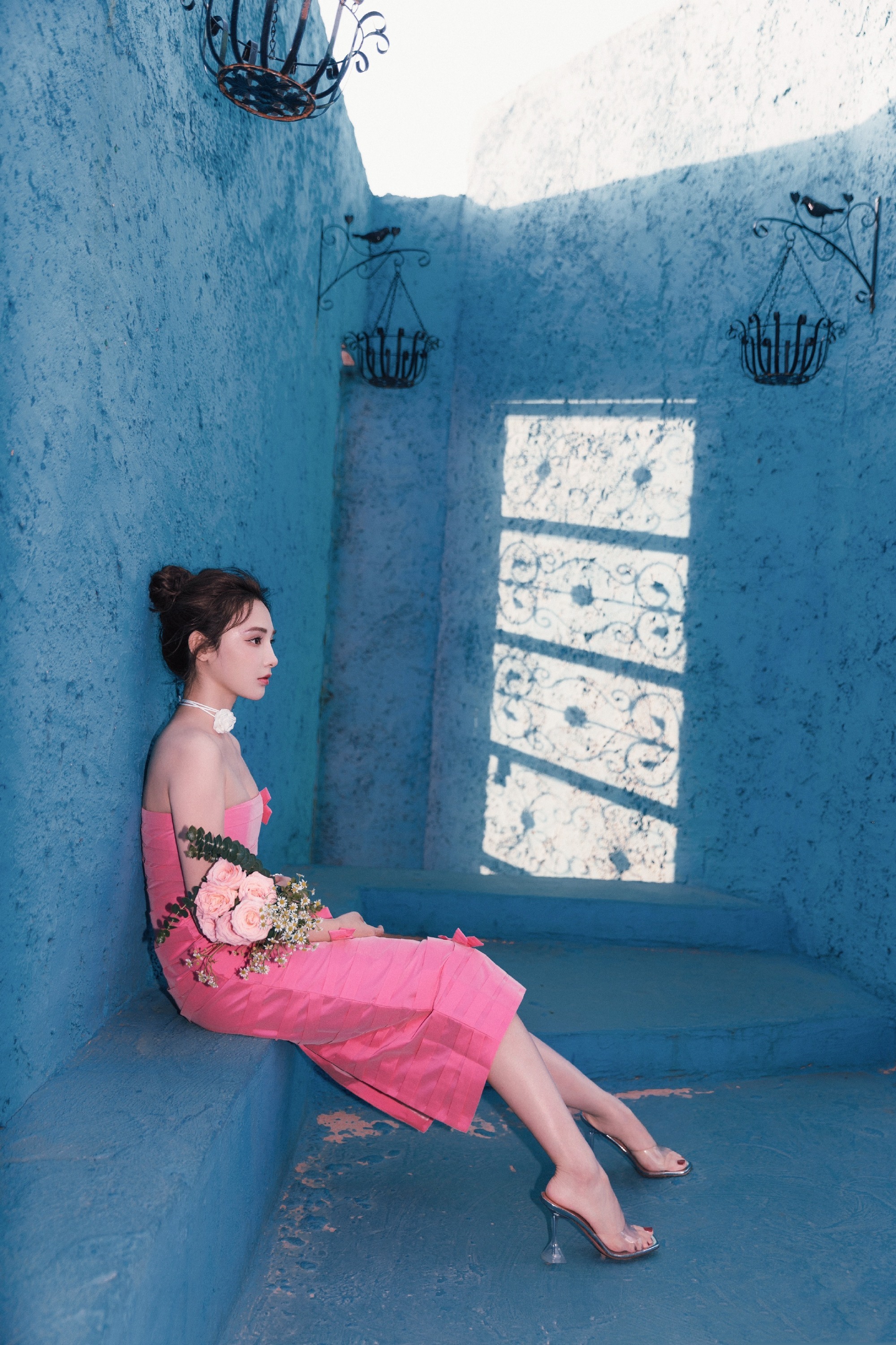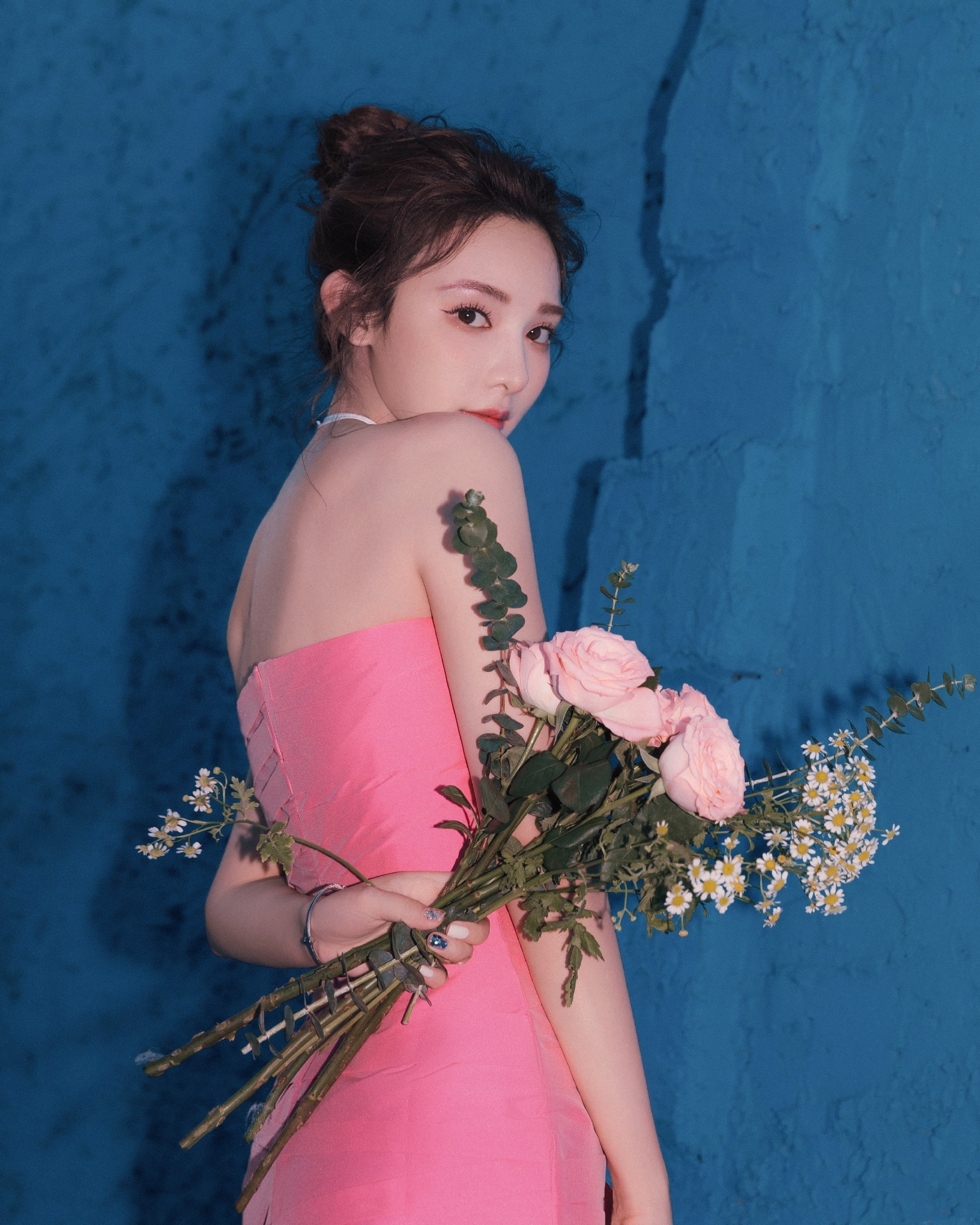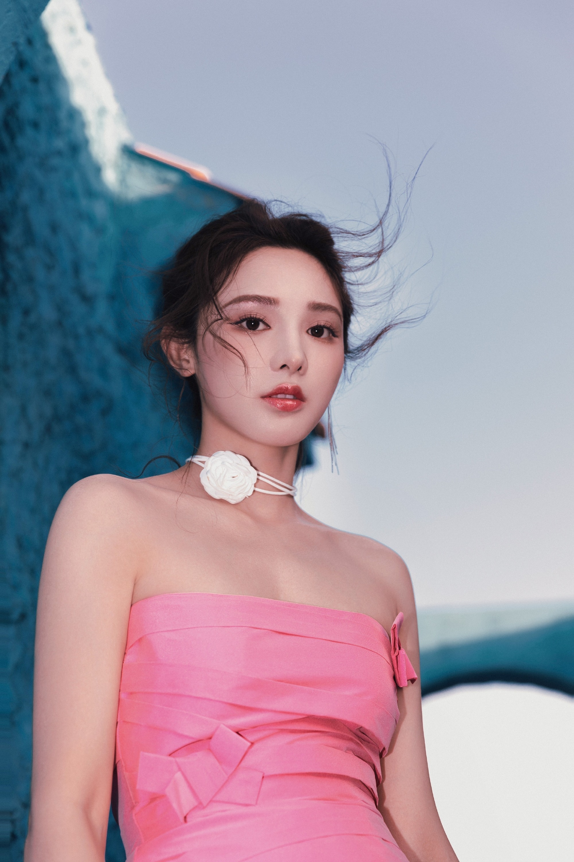 彭小苒,撞色多巴胺穿搭:粉红抹胸裙优雅迷人。彭小苒