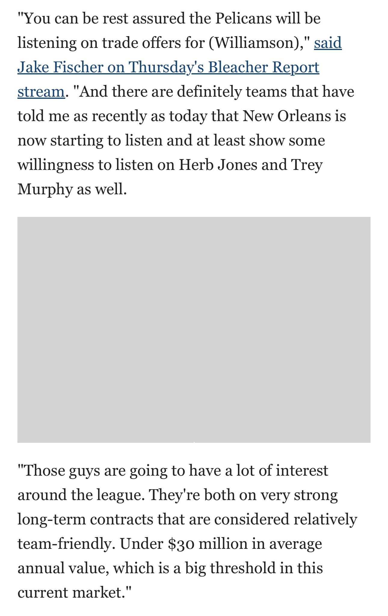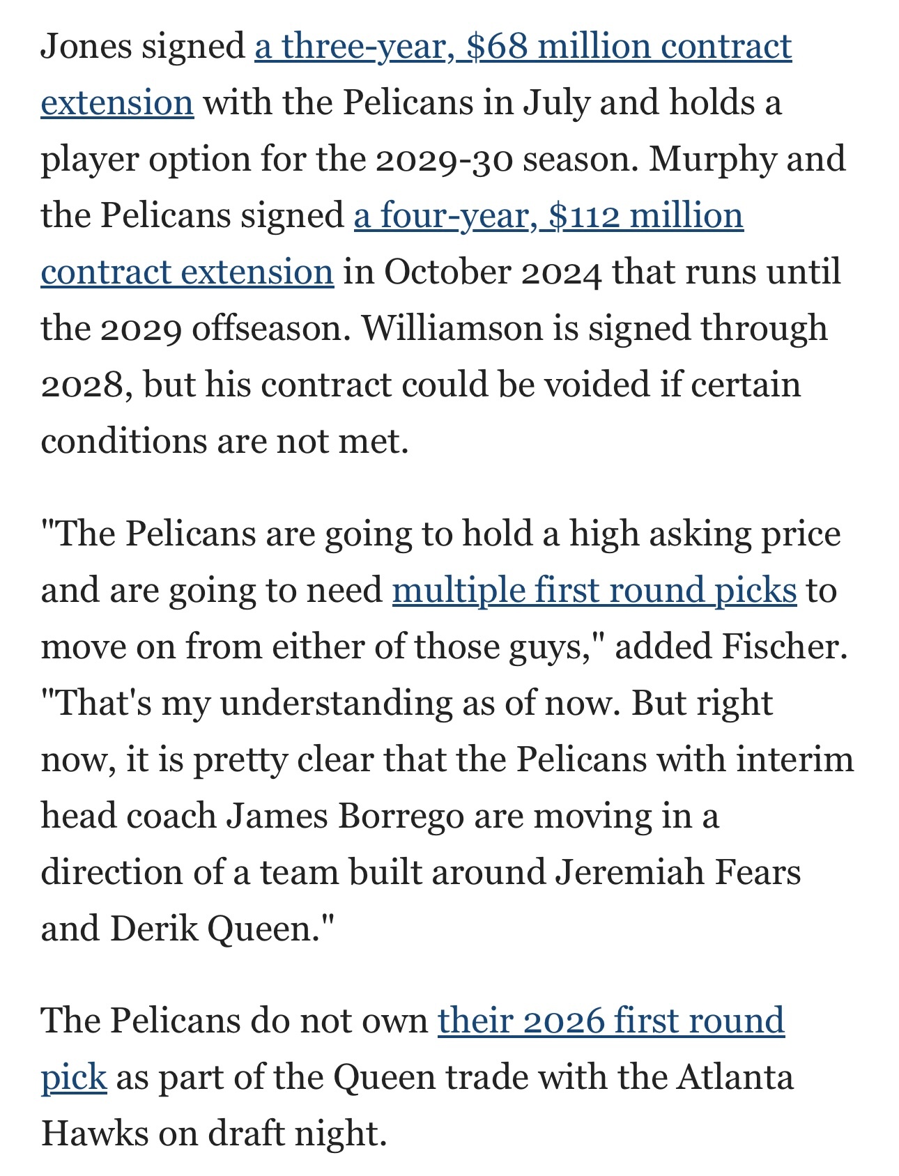 记者Jake Fischer:鹈鹕愿意听取关于特雷墨菲和赫伯琼斯的交易报价。原本想要冲击季后赛的鹈鹕准备调整建队思路,打算围绕费尔斯、奎因打造阵容,同时开始表现出了愿意倾听联盟各队关于墨菲、琼斯和锡安交易报价的意愿。联盟里会有很多球队对这两人感兴趣,他们都签有非常优质的多年合同,且价格相当友好,年均价值不到3000万美元,这在当前的市场环境下是一个重要的门槛。赫伯琼斯在今年7月与鹈鹕签下了三年6800万美元的续约协议,拥有2029-30赛季的球员选项。墨菲则在去年10月与鹈鹕达成四年1.12亿美元的续约,合同将持续到2029年休赛期。锡安的合同签到2028年,但如果未能满足特定条件,这份合同可能会失效。Fischer补充道,鹈鹕会为这两位侧翼悍将开出高报价,想要得到任何一位,至少要拿出多个首轮签。