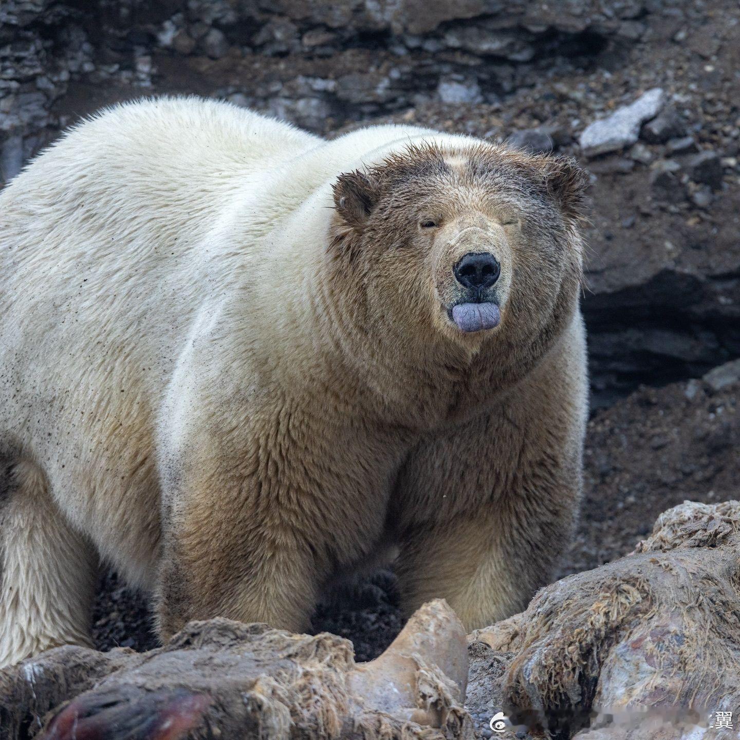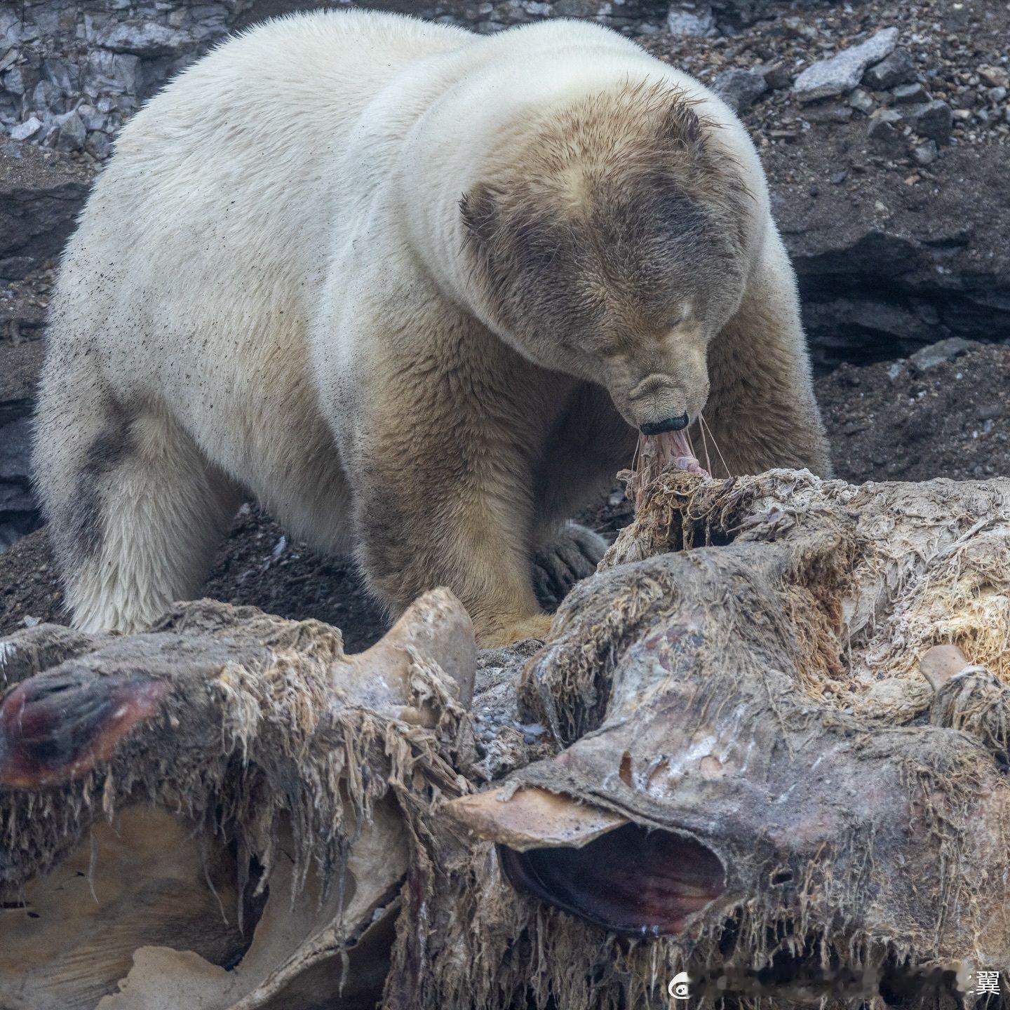 挪威,一只体型巨大的北极熊正在啃食鲸鱼,舌苔很厚湿气重。