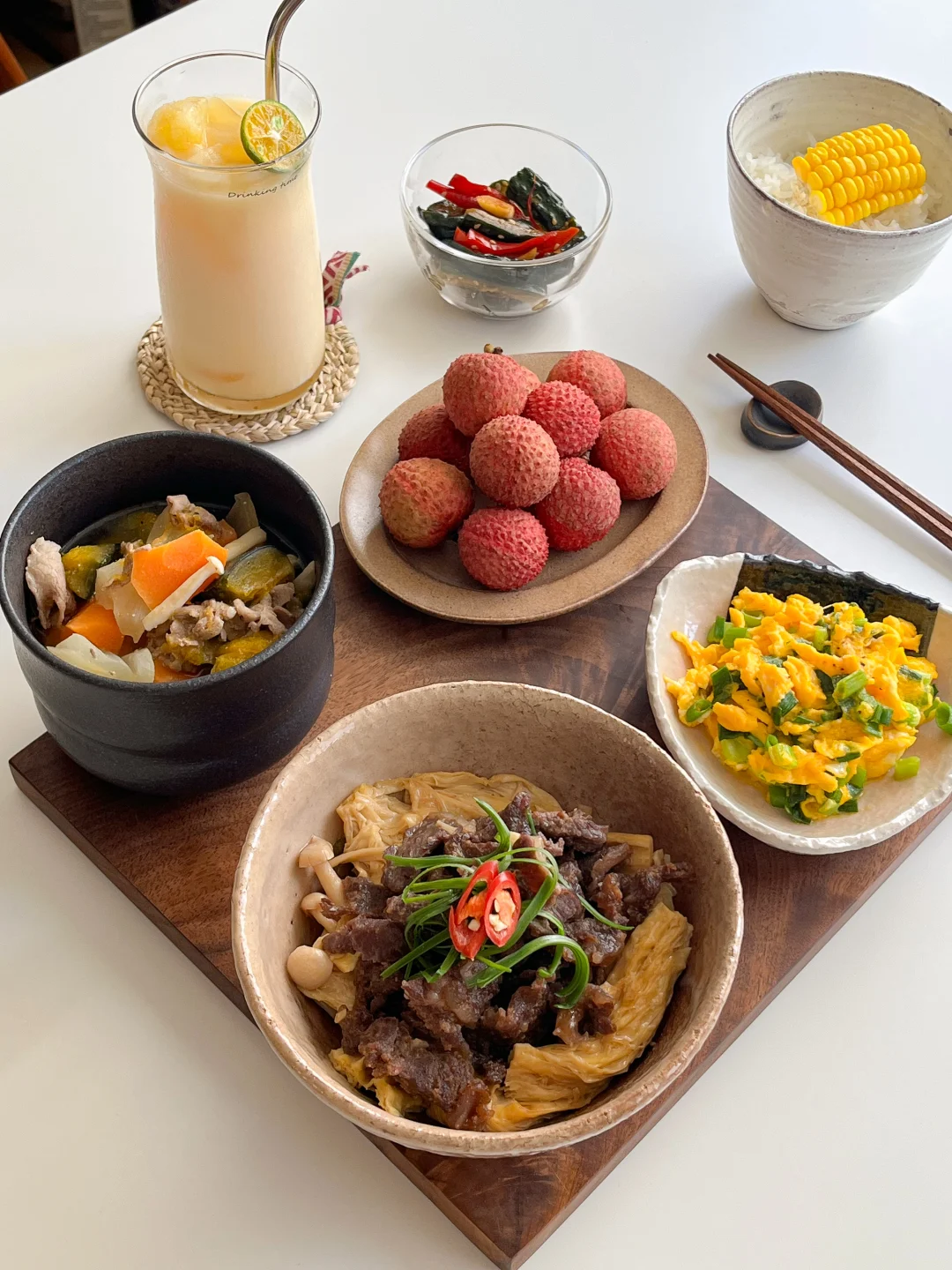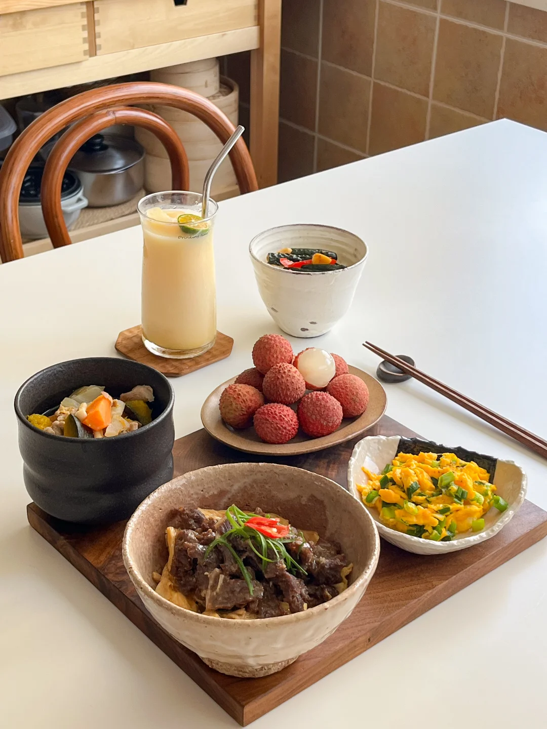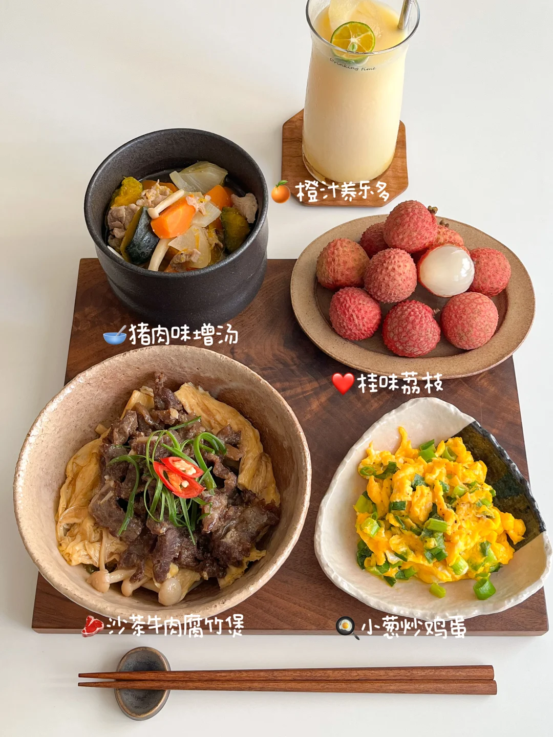 今天的饭: 沙茶牛肉腐竹煲🥩 桂味荔枝 小葱炒鸡蛋🍳 猪肉味增汤🥣 小黄瓜咸菜🥒