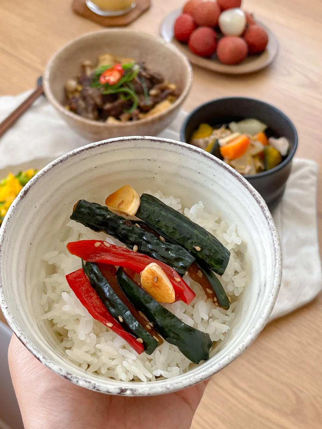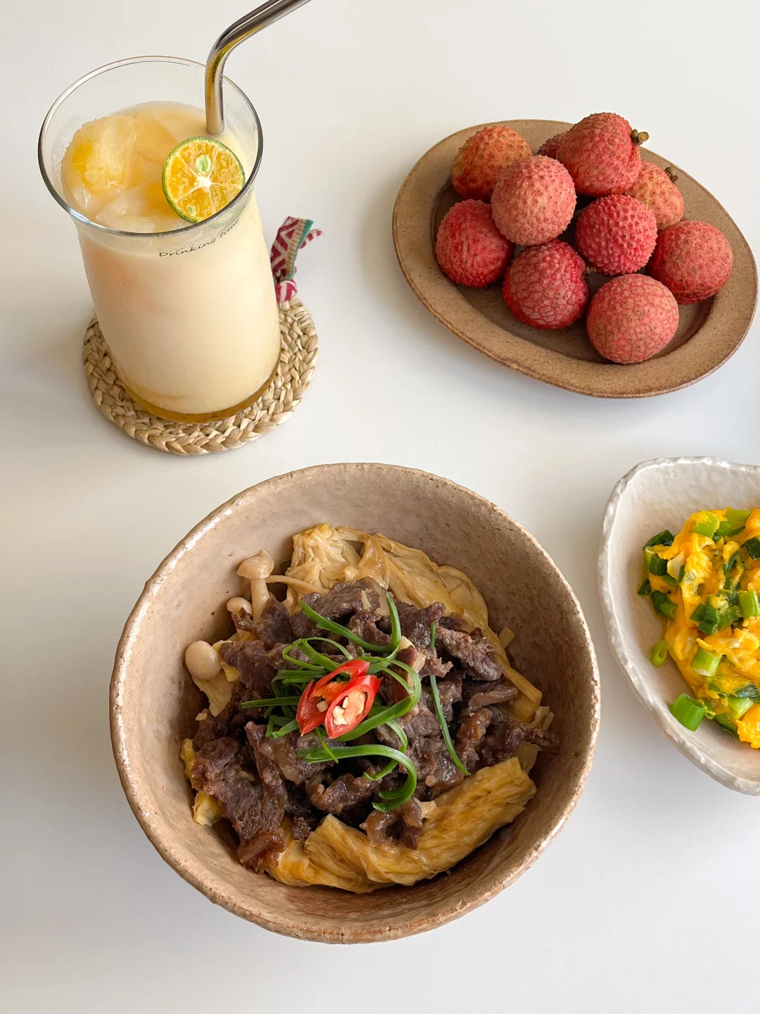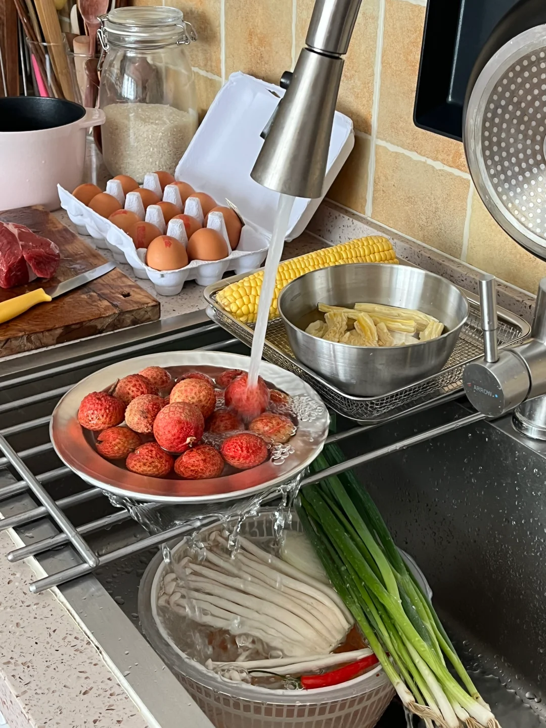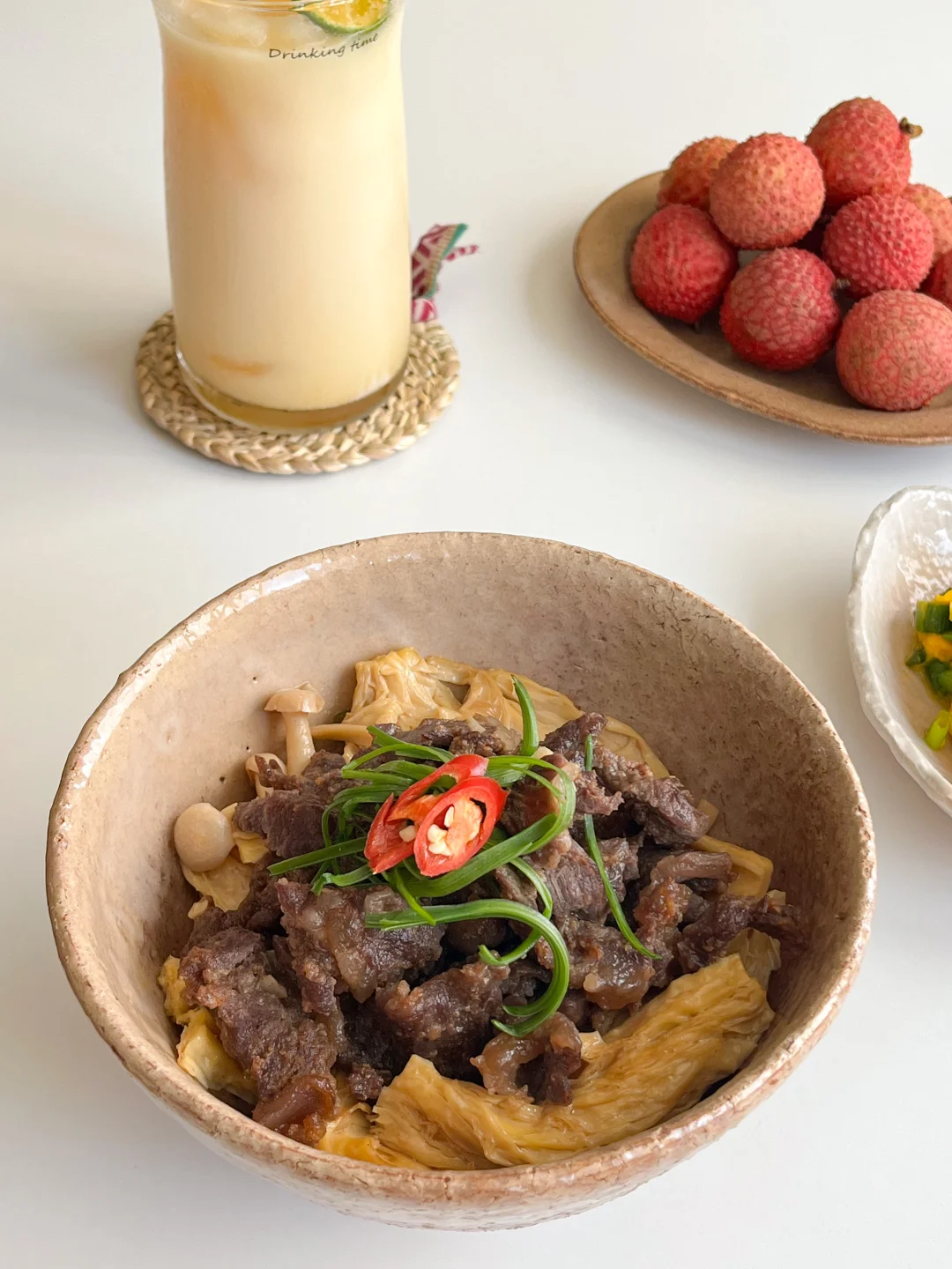 今天的饭: 沙茶牛肉腐竹煲🥩 桂味荔枝 小葱炒鸡蛋🍳 猪肉味增汤🥣 小黄瓜咸菜🥒