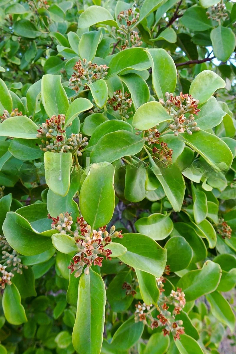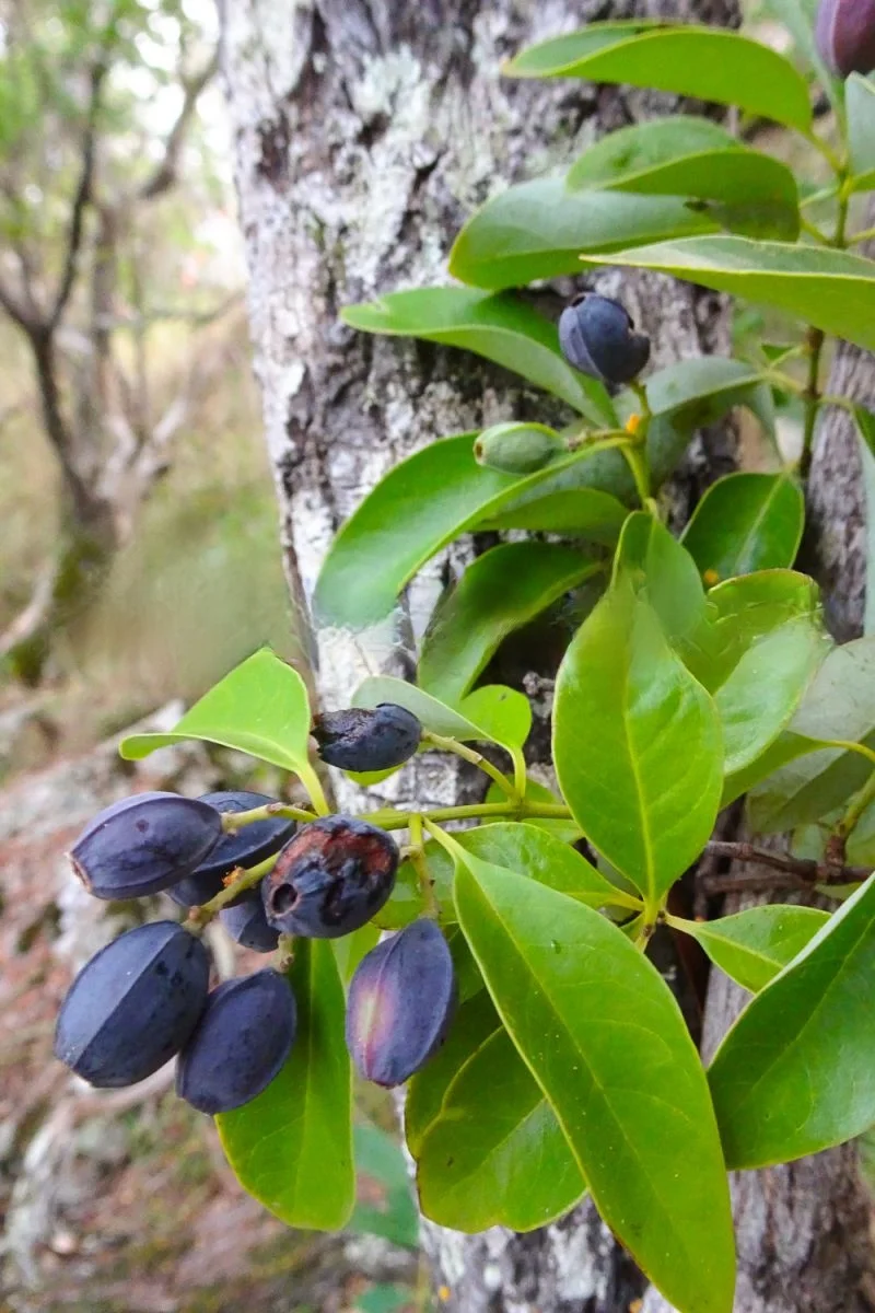 图9~12新喀里多尼亚檀香Santalum austrocaledonicum 檀香科的一种檀香树。它是一种树皮灰色、叶子绿色的小树,是寄生性的。由于伐木,大多数已被从栖息地移走;野外仅存的树木很少。
