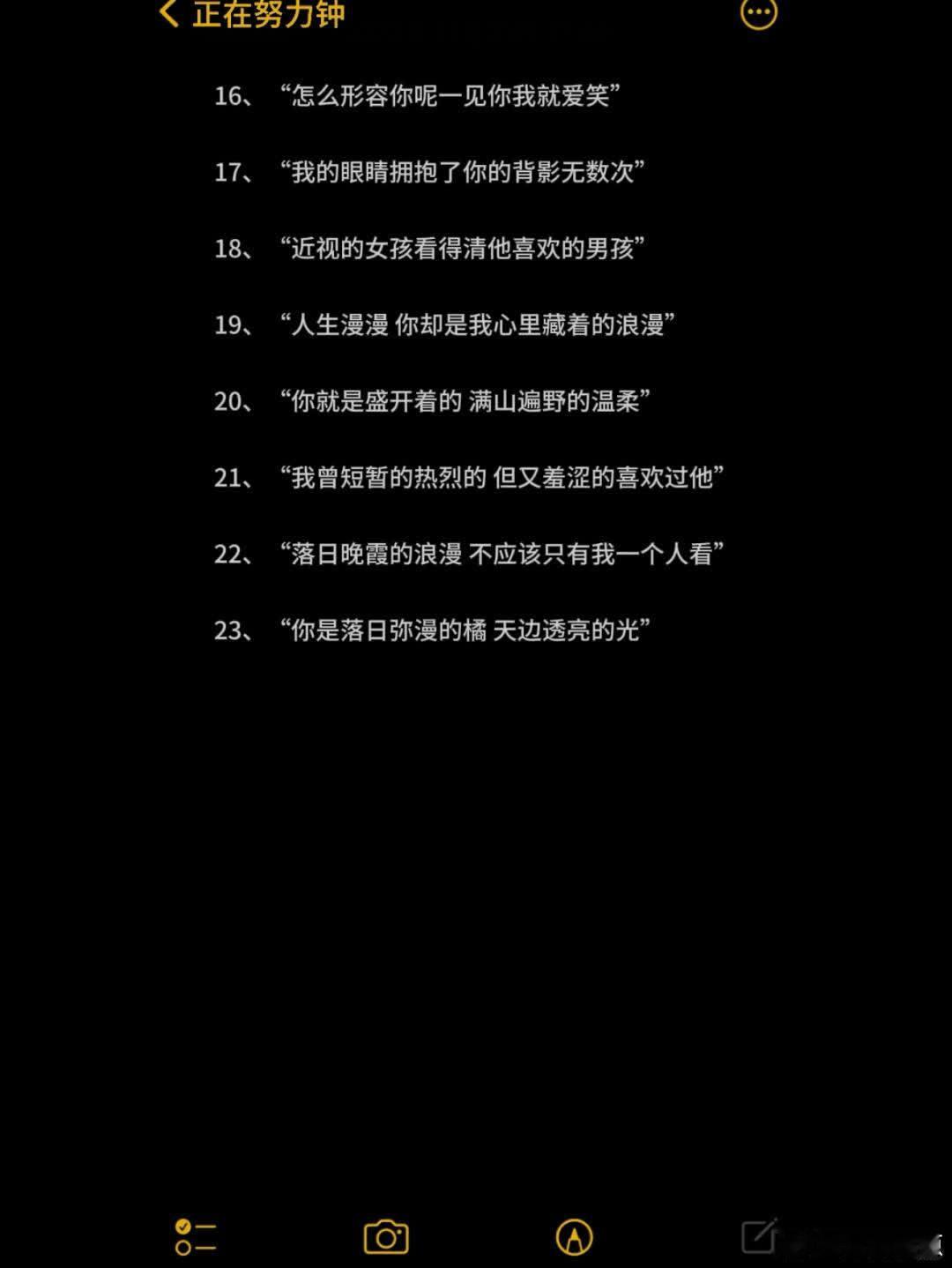 近期杀疯了的小众心动文案分享 1、“对视吧 眼睛很难说谎” 2、“记忆生了锈 誓言也作废” 3、“我关掉月亮 你甚至更明朗” 4、“草稿纸上的名字都是很有意义” 5、“如果是你的话 凌晨三点我也陪你” 6、“我一直捏着书页,不想让你翻篇” 7、“没人能代替你 即使我们好久不见” 8、“开启蓝牙 能连接你的心吗” 9、“真不是恋爱脑 我恋爱没脑子” 10、“我现在正式申请进入你的生活” 11、“其实我不太懂喜欢 可我想走向你” 12、“非要长的像沼泽一样你才会沦陷吗” 13、“心动从第一眼开始” 14、“爱意藏不住眼里总有你” 15、“你是心头一热也是不动声色” 16、“怎么形容你呢一见你我就爱笑” 17、“我的眼睛拥抱了你的背影无数次” 18、“近视的女孩看得清他喜欢的男孩” 19、“人生漫漫 你却是我心里藏着的浪漫” 20、“你就是盛开着的 满山遍野的温柔” 21、“我曾短暂的热烈的 但又羞涩的喜欢过他” 22、“落日晚霞的浪漫 不应该只有我一个人看” 23、“你是落日弥漫的橘 天边透亮的光”