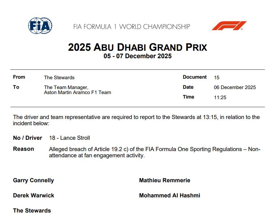 阿斯顿马丁两位车手没有参加粉丝互动活动,被上报赛事干事2025f1阿布扎比大奖赛