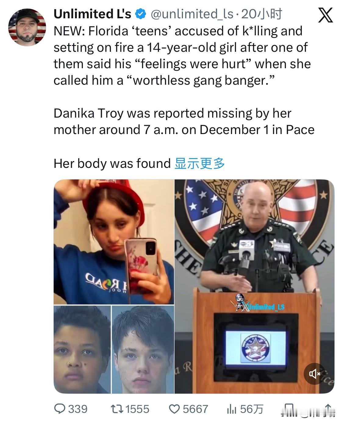 最新消息:美国佛罗里达州几名“青少年”被控杀害并焚烧一名14岁女孩,其中一人称女孩称他为“没用的帮派分子”后,表示“他的感情受到了伤害”。 丹妮卡·特洛伊的母亲于12月1日早上7点左右在佩斯报案称她失踪。 第二天,一名路人发现了她的尸体,并打电话报警。 16岁的加布里埃尔·威廉姆斯和14岁的基马里·布莱文斯因涉嫌预谋一级谋杀罪被拘留。 警长说,威廉姆斯偷了他母亲的手枪,并开枪射杀了特洛伊。