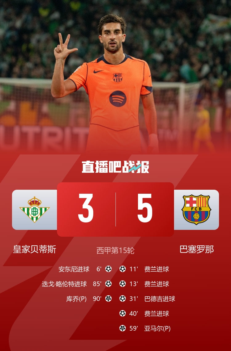 巴萨客场5-3击败贝蒂斯,先赛4分领跑!费兰本场戴帽。