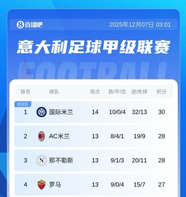 意甲积分榜:国米先赛暂2分优势领跑,明天那不勒斯vs尤文