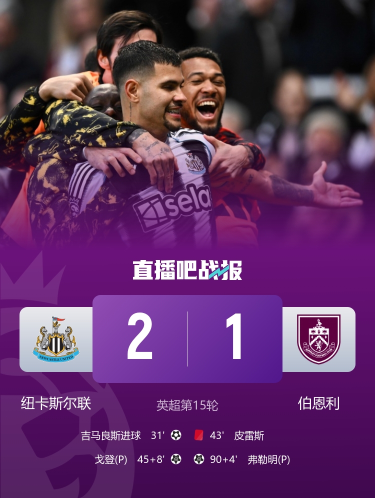 纽卡2-1击败伯恩利,吉马良斯角球直接破门,戈登点射。
