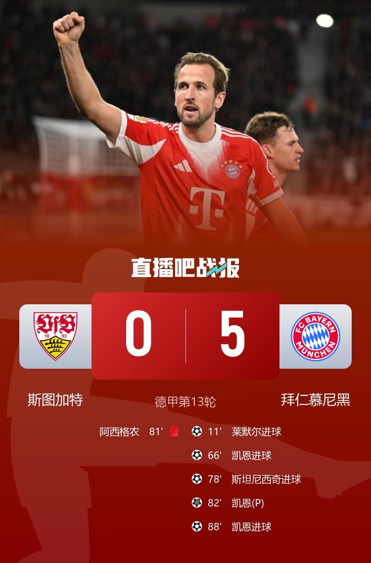拜仁本轮5-0横扫斯图加特,球队在联赛继续不败,凯恩本场戴帽。
