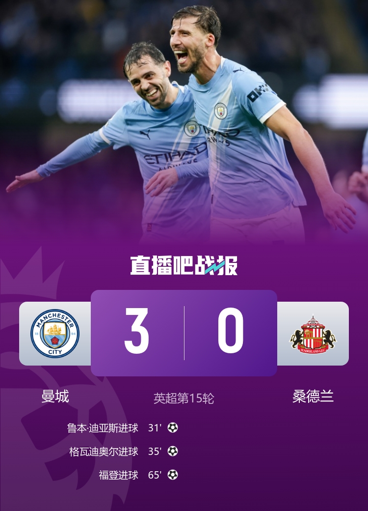 距榜首2分!曼城3-0桑德兰三连胜回第二迪亚斯世界波谢尔基2助