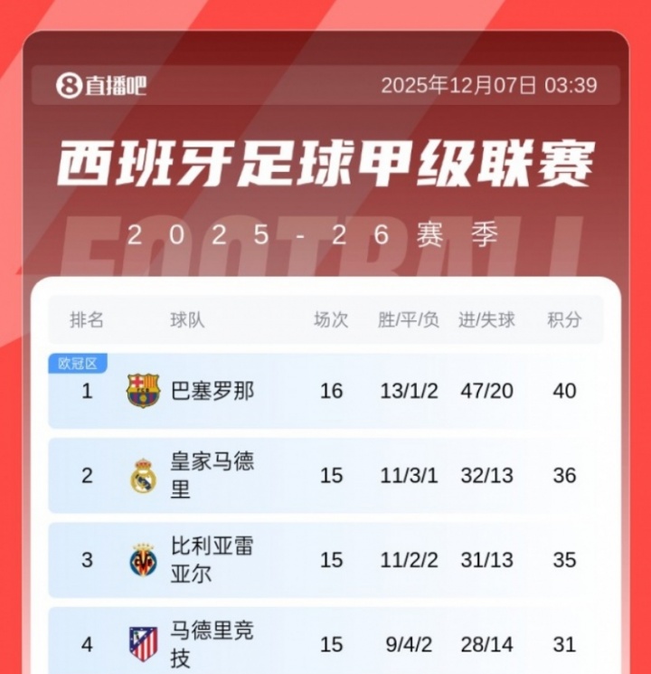 西甲积分榜:巴萨先赛4分优势领跑!皇马明晨迎战塞尔塔,马竞第4