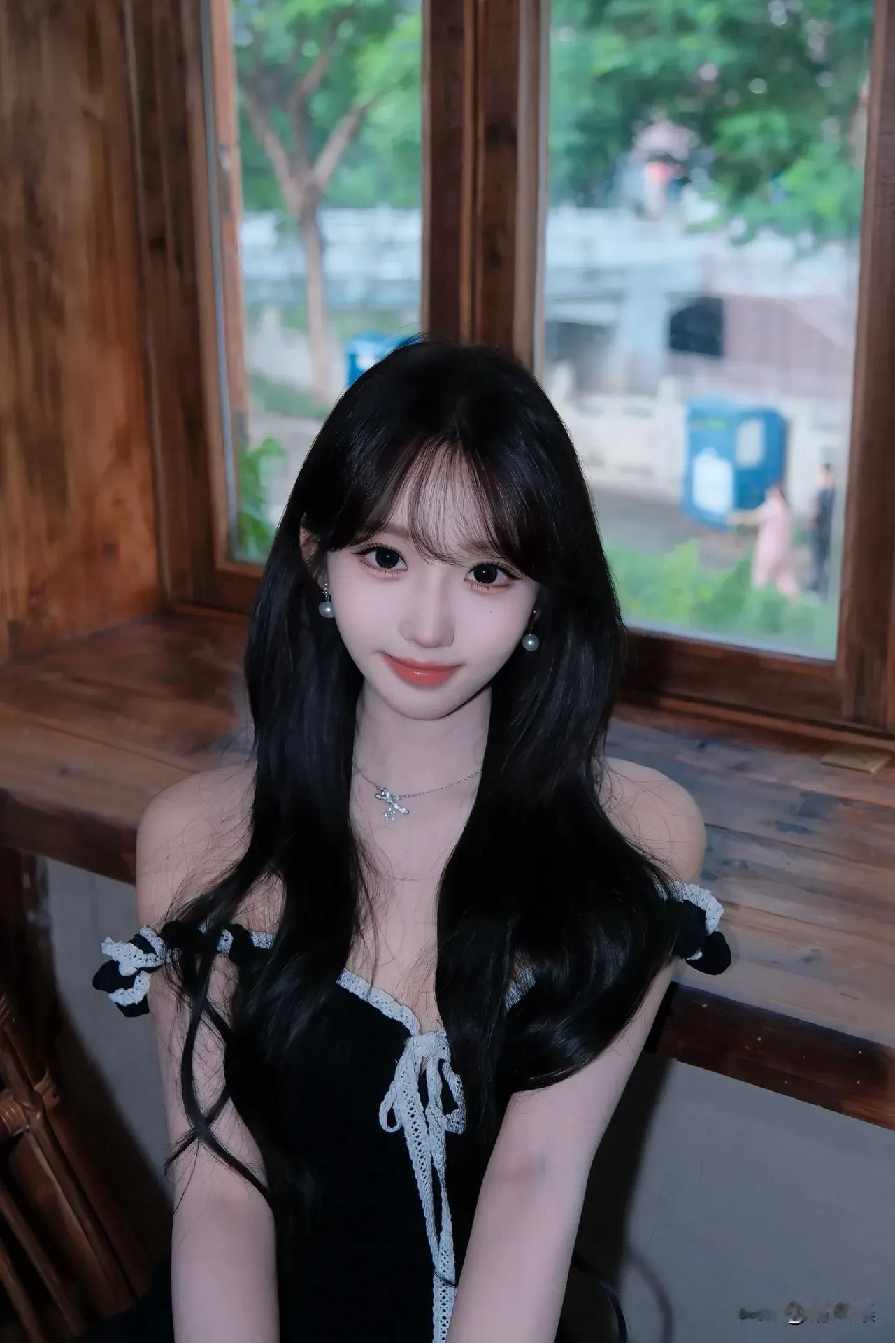 窗边少女,黑发红唇,甜美可人,温柔似水。