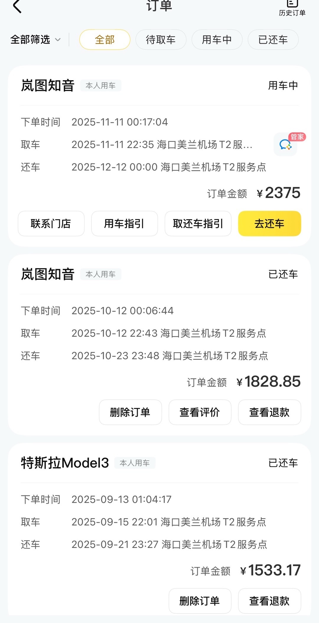 粉丝投稿:分享一下租车经验,我每个月都要去海南出差,正常7天左右,这次比较久30天,神州租车有一个尊享保险服务,498管3个月,期间租车都不需要额外付保险了,岚图知音,3个月内新车30天租金实付:2375-440=1935。如果偶尔租一次,一嗨性价比更高,经常有优惠券推送,租金也比神州低一些。