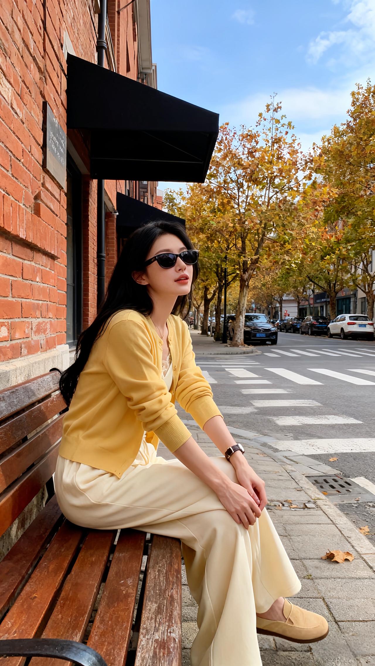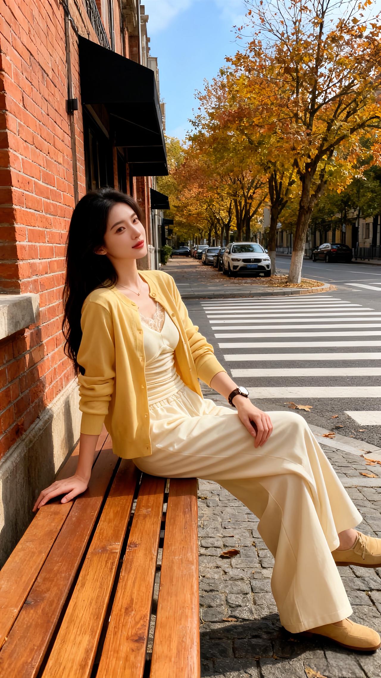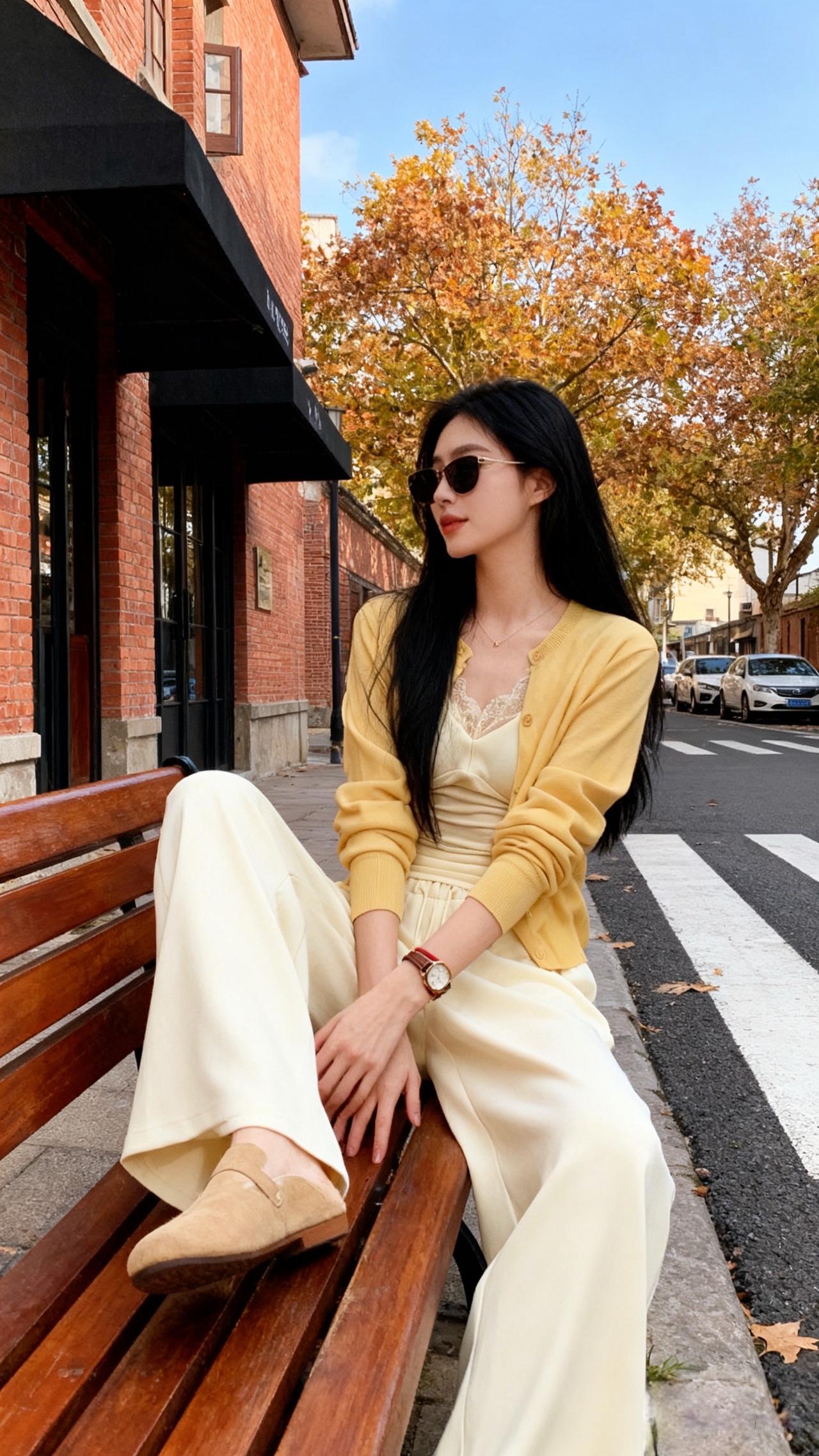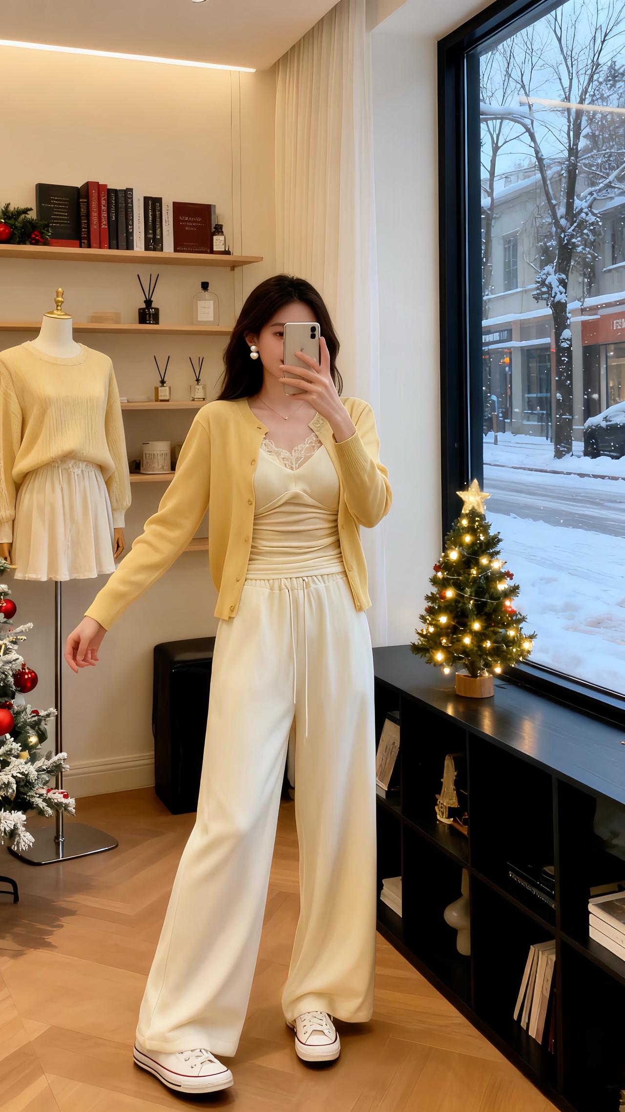 圣诞夜的暖灯刚爬上画架的木纹,她蜷在黑高脚凳上比了个轻快的“V”——身上那件鹅黄针织开衫扣得整整齐齐,软绵的针脚裹着肩线,袖口顺着小臂堆出松弛的褶皱;内搭是同色系的蕾丝吊带,褶皱收腰刚好掐出柔缓的曲线,下身的白色阔腿裤垂坠感裹着脚踝,裤脚擦过白帆布鞋的鞋帮,像把整间屋的暖光都揉进了衣褶里。 珍珠耳钉垂在耳侧,细链项链贴着锁骨,手腕上的红棕细带和圣诞摆件的红金撞在一处,连带着身后画架上的同款穿搭图,都浸着甜而不腻的节日温软。针织衫 温柔风穿搭简约穿搭 ins穿搭