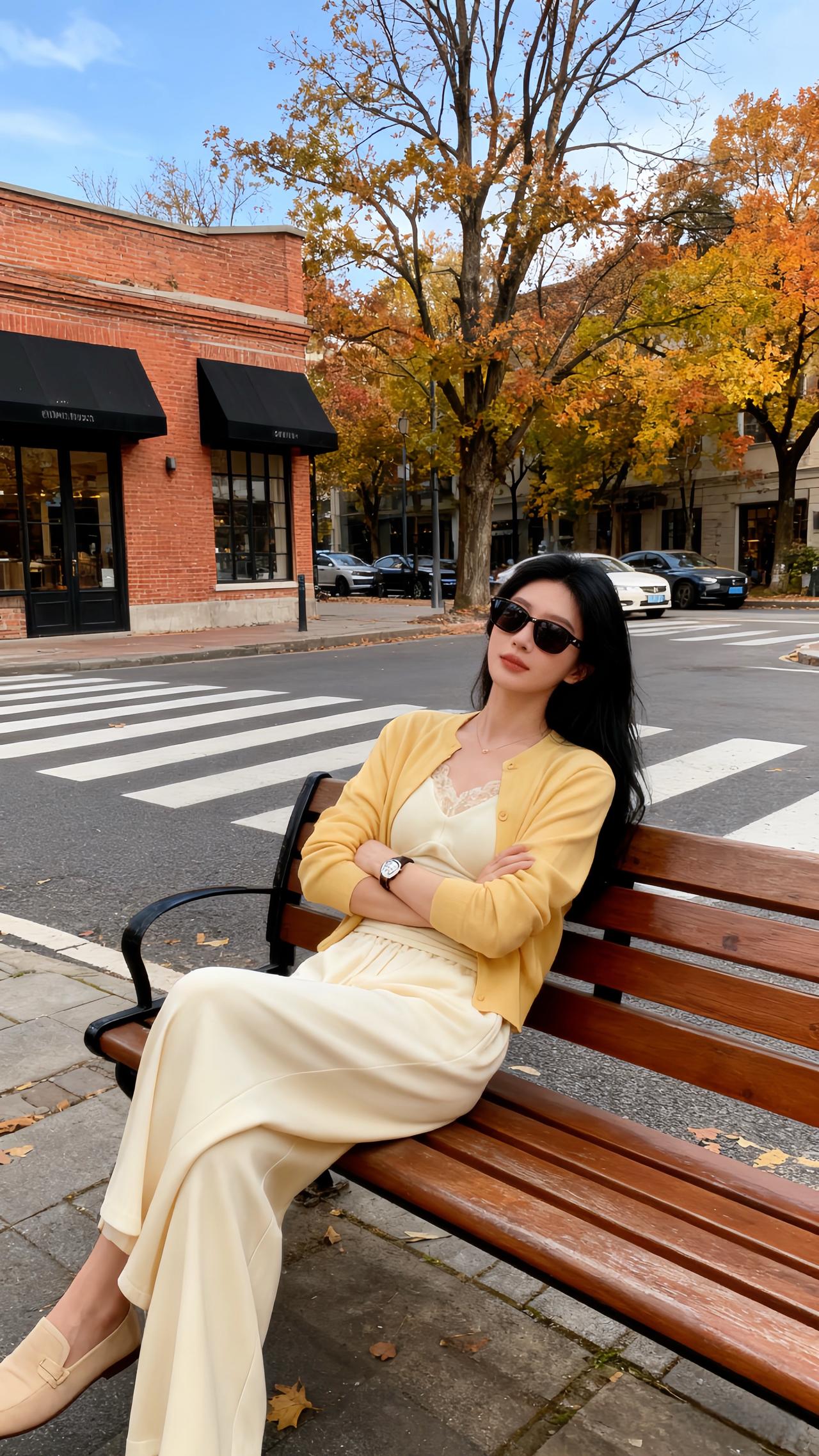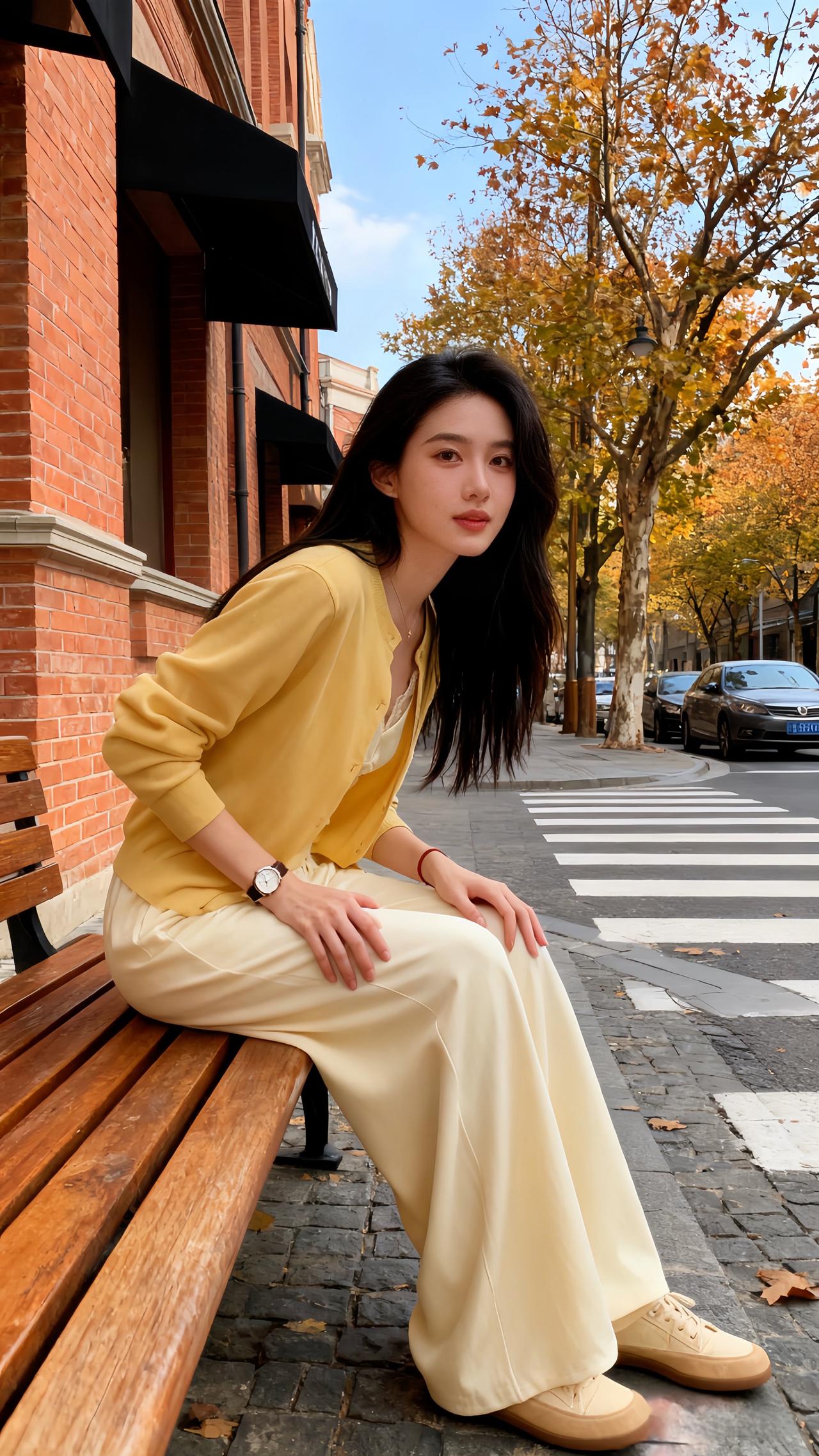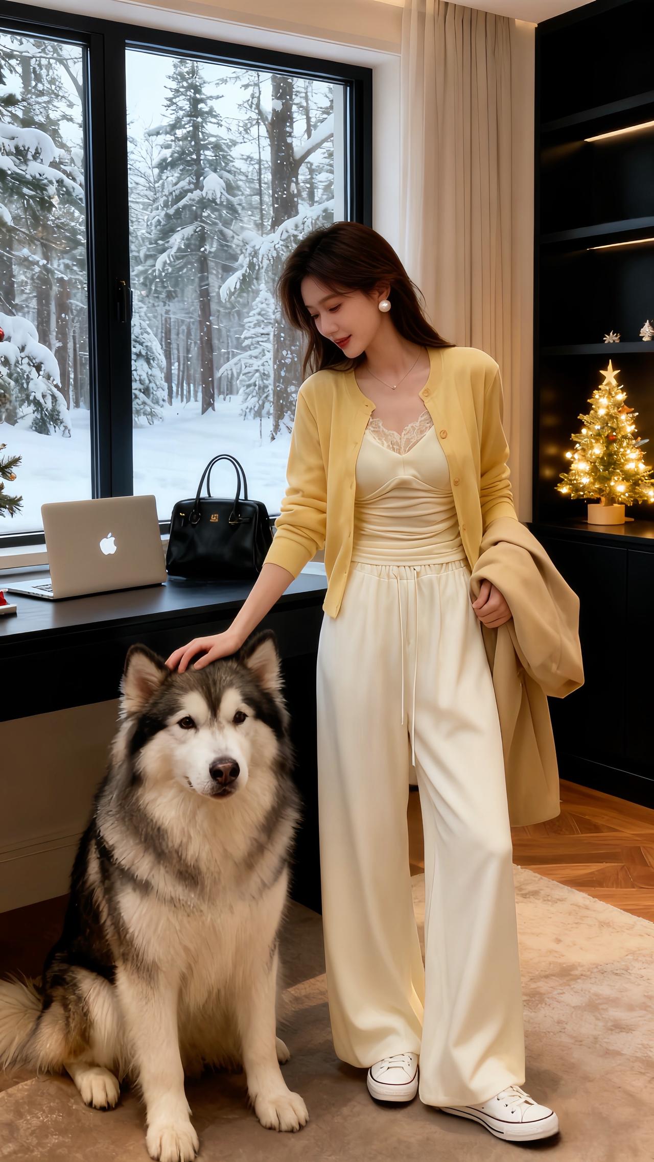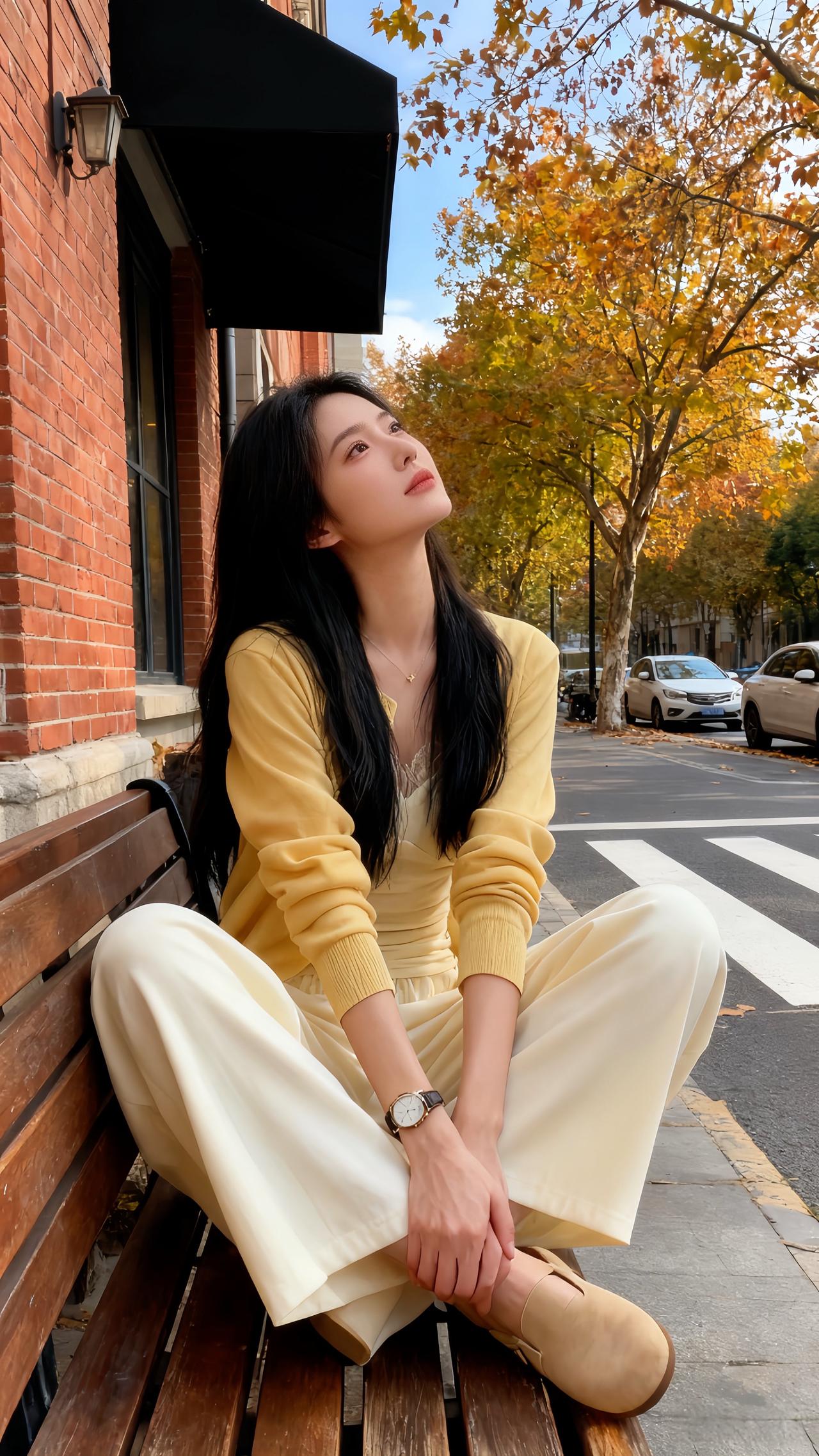 圣诞夜的暖灯刚爬上画架的木纹,她蜷在黑高脚凳上比了个轻快的“V”——身上那件鹅黄针织开衫扣得整整齐齐,软绵的针脚裹着肩线,袖口顺着小臂堆出松弛的褶皱;内搭是同色系的蕾丝吊带,褶皱收腰刚好掐出柔缓的曲线,下身的白色阔腿裤垂坠感裹着脚踝,裤脚擦过白帆布鞋的鞋帮,像把整间屋的暖光都揉进了衣褶里。 珍珠耳钉垂在耳侧,细链项链贴着锁骨,手腕上的红棕细带和圣诞摆件的红金撞在一处,连带着身后画架上的同款穿搭图,都浸着甜而不腻的节日温软。针织衫 温柔风穿搭简约穿搭 ins穿搭