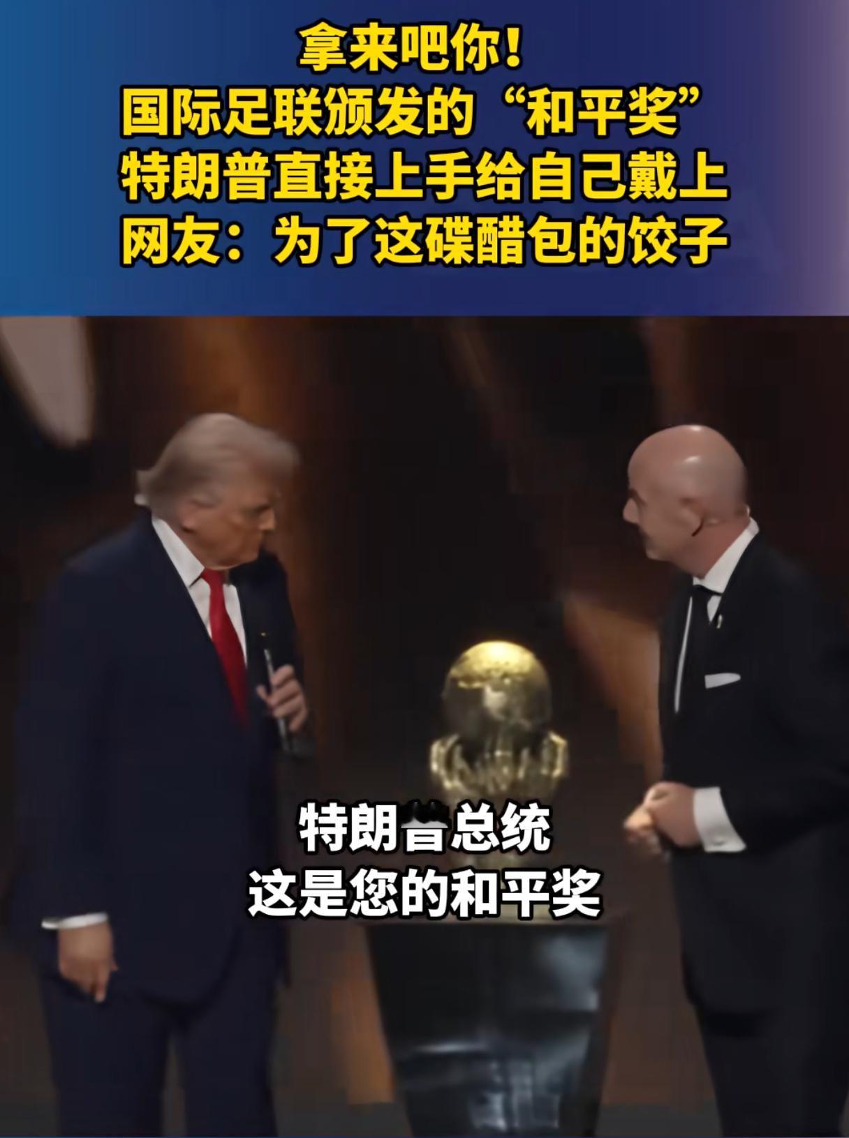离了个大谱,国际足联发“和平奖”?! 国际足联主席这波操作真是让人惊掉下巴!当地时间12月5日,世界杯抽签仪式上,他给特朗普颁发了“2025年国际足联和平奖”。这可是国际足联11月新设立的新奖项,说是认可为和平努力的人。 特朗普那叫一个开心,还自夸拯救了数千万人生命,阻止了多场战争。可现实呢,他还打算对委内瑞拉采取打击行动,哪有和平的样子?而且这奖项都没获理事会批准,宣布得不明不白。美国民主党也不买账,加州州长调侃是“开心乐园奖”。 这国际足联主席妥妥“马屁精”,这奖颁得太荒谬了。 特朗普雷人言论 特朗普诺奖