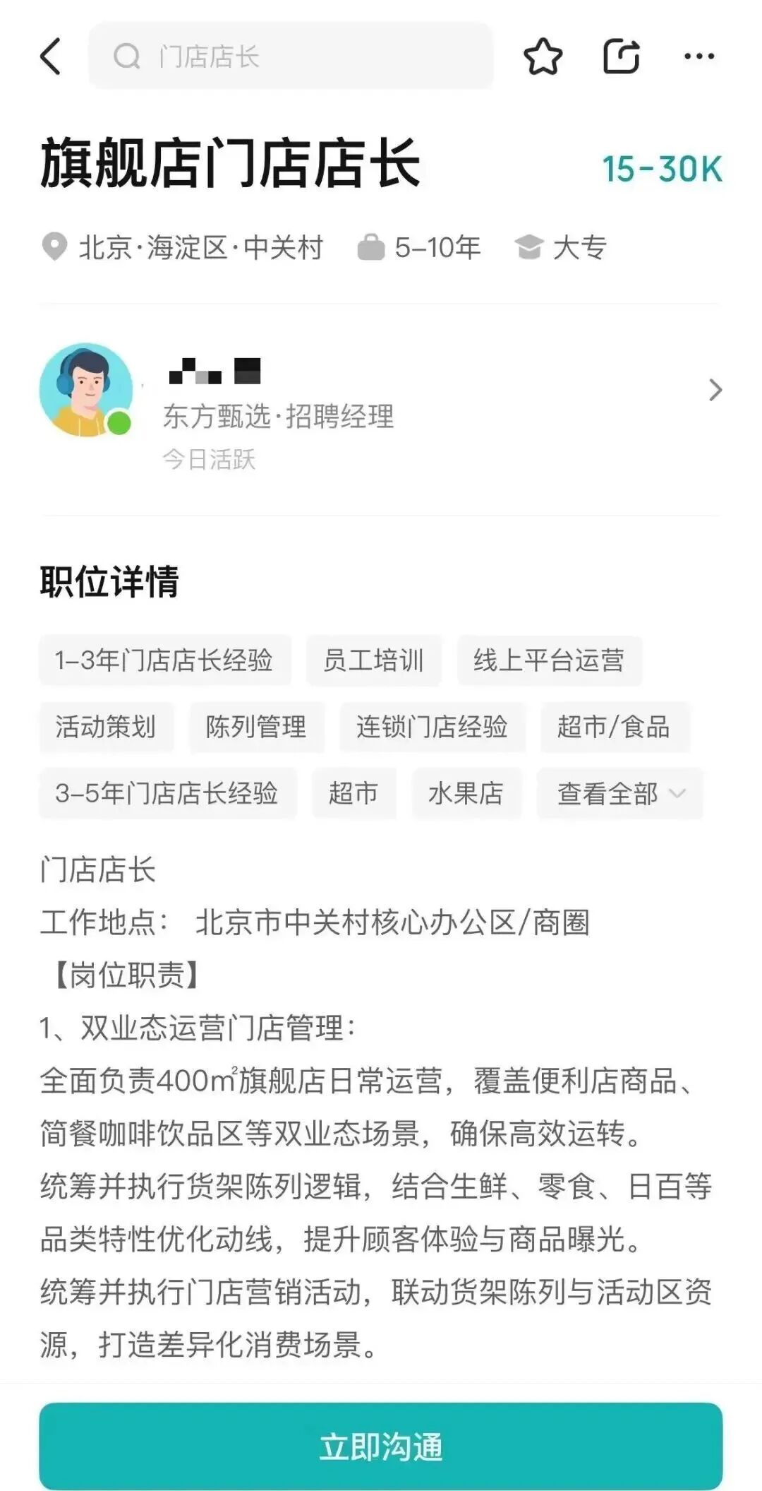 据招聘信息,东方甄选以1.5万至3万元的月薪,招募旗舰店门店店长以及储备店长。招聘要求明确指向“餐饮+零售”的复合业态管理经验,并优先考虑拥有便利蜂、7-Eleven、罗森等知名连锁品牌背景的人才,带过15人以上的团队。